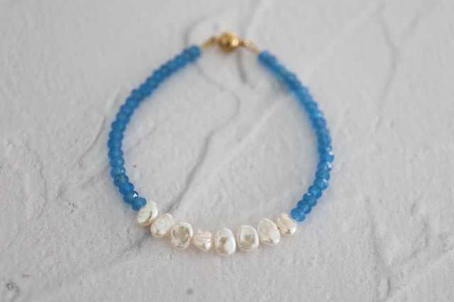 【商品説明】 艶の良いケシパールと、 くっきりした青空のような色合いの青瑪瑙(ブルーアゲート)のブレスレットです。 青瑪瑙は、古来より魔除けの石として使われ、 10月の誕生石のひとつとされています。 ケシパールのやわらかな白と、、瑪瑙の澄んだ青。 その美しいコントラストが、存在感を放つブレスレットです。 留め具はマグネット仕様。 さっと簡単に着け外しができます。 【素材 サイズ】 金具…マグネット合金 瑪瑙4×4×3㎜ ケシパール5×7×3㎜前後 ブレスレットサイズ 金具を含めた平置き18cm(内径16.5㎝)