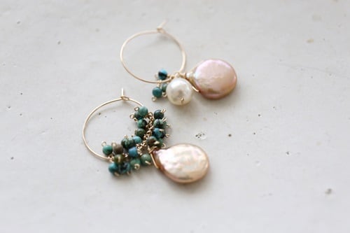 【商品説明】 神秘的なニュアンスをまとった、魅力あふれるフローライト。 別名「天才の石」とも呼ばれ、 子どものような自由な感性を引き出し、 豊かなアイデアやひらめきを与えてくれるといわれています。 つるんと丸みを帯びた雨粒のようなしずく型は、 瑞々しく透明感があり、落ち着いた印象。 ターコイズは、染色やスタビライズドではない 天然のナチュラルターコイズを使用。 自然そのものの表情をお楽しみいただける素材です。 濃いグリーンカラーに、 独特のマーブルや縞模様をもつマラカイト。 クレオパトラも愛した天然石として知られています。 マラカイトとターコイズをハーフで配し、 センターにはフローライトを合わせたデザイン。 全体をシックな色味でまとめ、 大人の落ち着きを感じるフープピアスに仕上げました. 【素材 サイズ】 金属素材…ワイヤー フック全て14kgf (真鍮)に14金のゴールド圧着を施したものです。 表面は完全な14金となっております。 ターコイズ4mm マラカイト4mm フローライト 14×10mm フープ25mm
