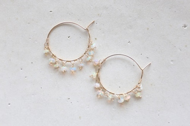 【商品説明】 艶やかなベース色に美しい遊色効果が輝く、 エチオピア産のハイクオリティーなプレシャスオパールです。 華奢なオパールを一粒ずつ丁寧に繋ぎました。 繊細でとても美しい仕上がりです。 【素材 サイズ】 金属素材…ワイヤー フック全て14kgf (真鍮)に14金のゴールド圧着を施したものです。 表面は完全な14金となっております。 オパール2×3mm フープ20mm