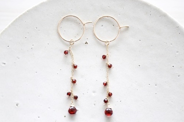 【商品説明】 小粒ラウンドとマロンカットのガーネットはどちらも、 カットがとても丁寧に施されているため 眩しいくらいの輝きに目を奪われます。 上品なレッドの色合いに、 申し分のない輝きをまとった洗練された印象のガーネット。 発色良く、透明感がしっかりあるトップクオリティのお品です。 14kgfのフープから取り外しできますので、 シンプルにフープのみでもお使いいただけます。 1月の誕生石です! 【素材 サイズ】 金属素材…すべて14kgf ガーネットラウンドカット2mmm マロンカット6×5mm