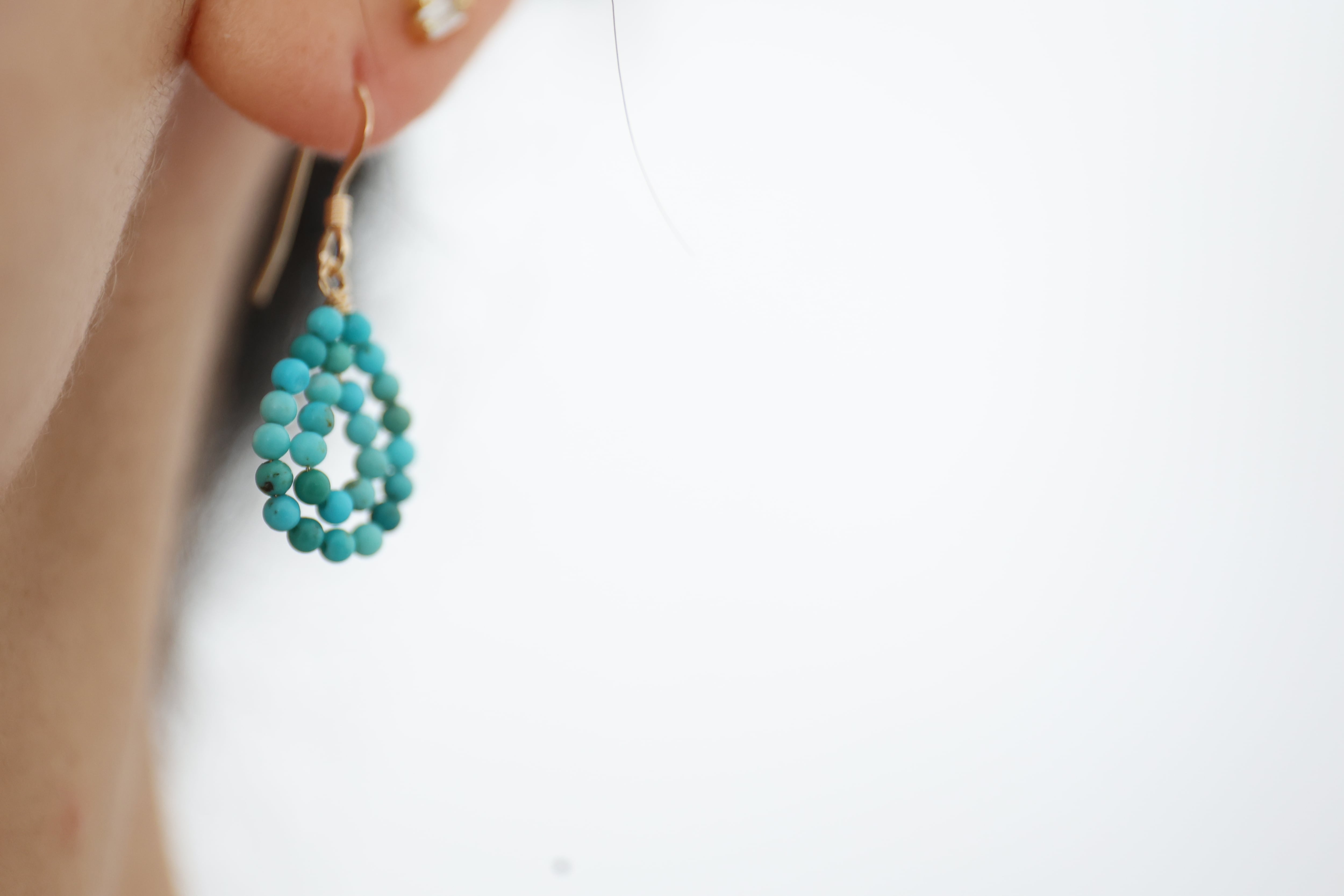 二重のしずく型が可愛らしい極小ターコイズのピアスは、どんなファッションにもよく似合います。