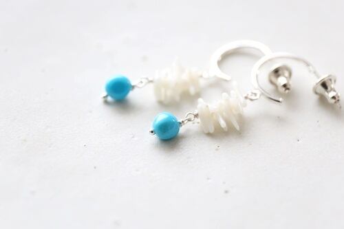 コロンとした可愛らしいターコイズと白珊瑚のピアスは、夏にぴったりのアイテムです。