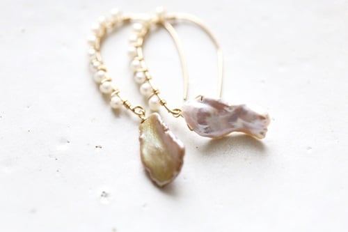 ワイヤーに、淡水パールを巻きつけ、アシンメトリーのケシをつけてみました。