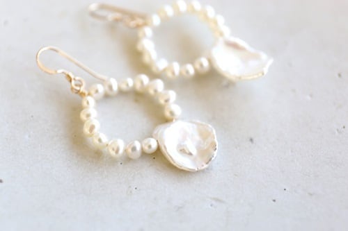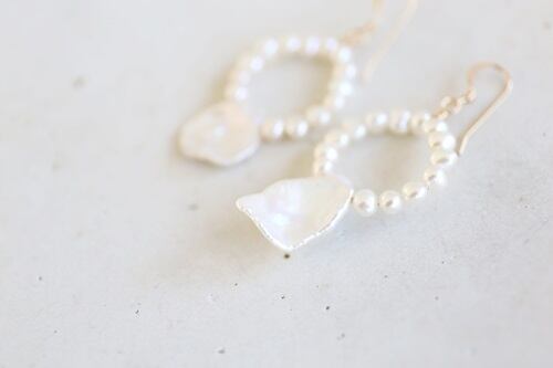 ひとひらの花びらのような薄いケシパールと、コロンとした可愛いポテトパールのピアス。