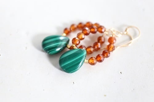 濃いグリーンカラーに独特のマーブルor縞模様をもつマラカイトを合わせて。