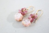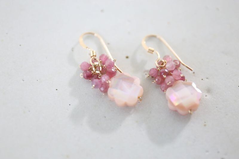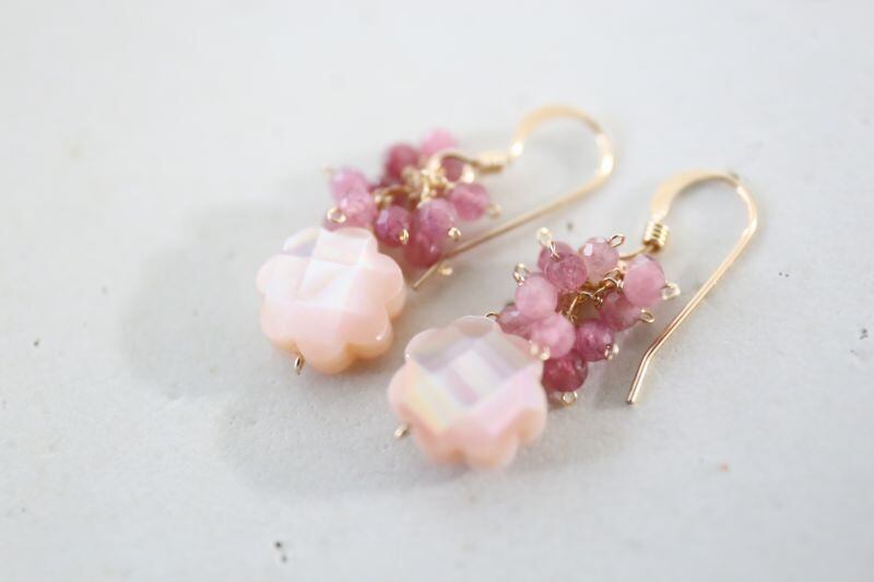 甘く優しいピンクのマザーオブパールは、お花の形。ハイグレードなカット入りで、揺れる度に美しく輝きます。