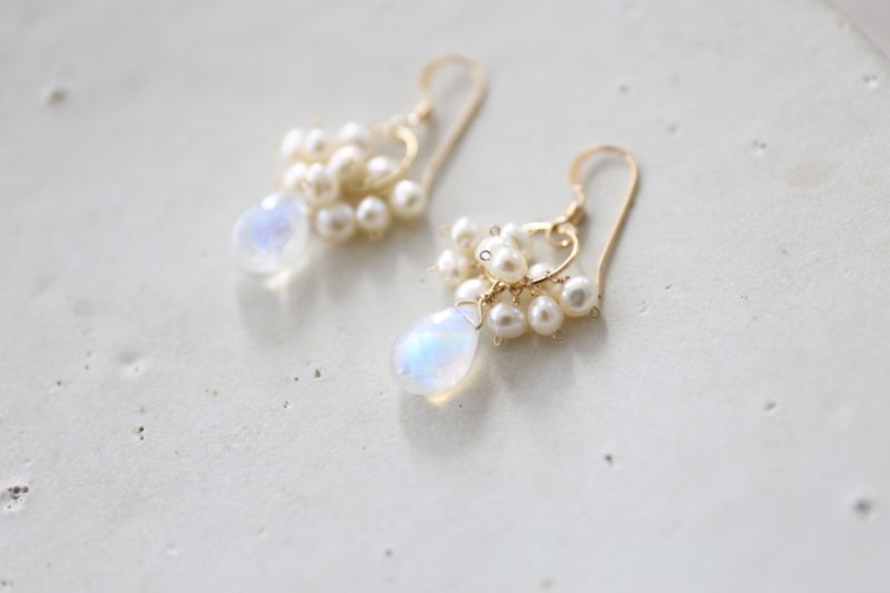 6月の誕生石ムーンストーンと、同じく6月の誕生石パールの、清楚で上品なピアスです。