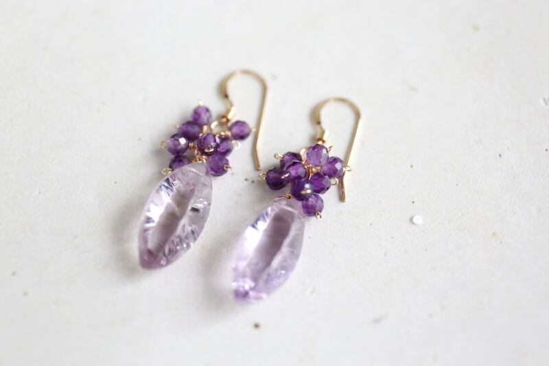 すみれ色のアメジストは、32面カットが施され、ピンクアメジストとともに、