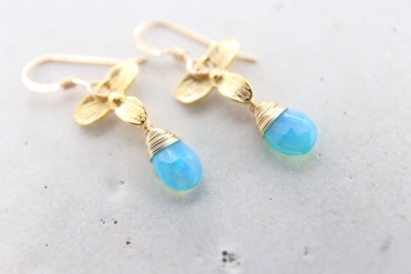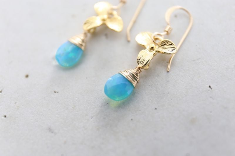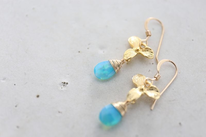ゴールドのお花のパーツの下で揺れるネオンブルーオパールは、