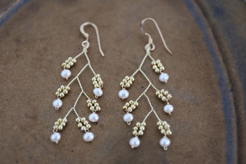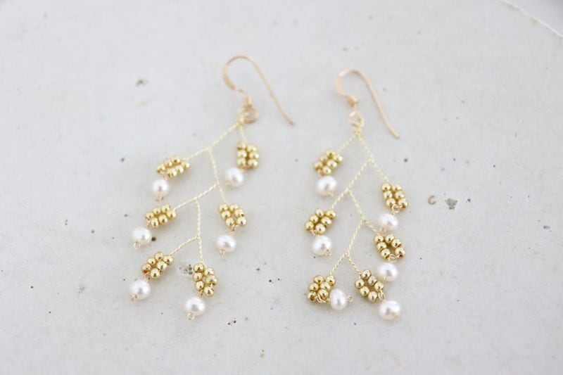 ゴールドカラーの繊細なビーズパーツに、照りの良いベビーパールを散りばめた上品なピアスです。