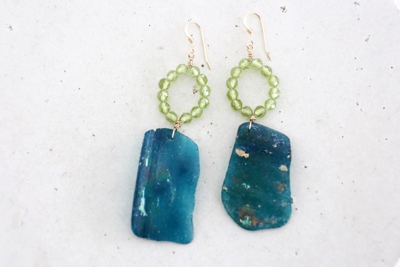 今回は特に虹色の銀化(地中でガラス内の物質が化学反応して、ガラス表面に虹色の模様が作られること。)が裏表にある美しい物を選び、64面カットのペリドットと合わせました。
