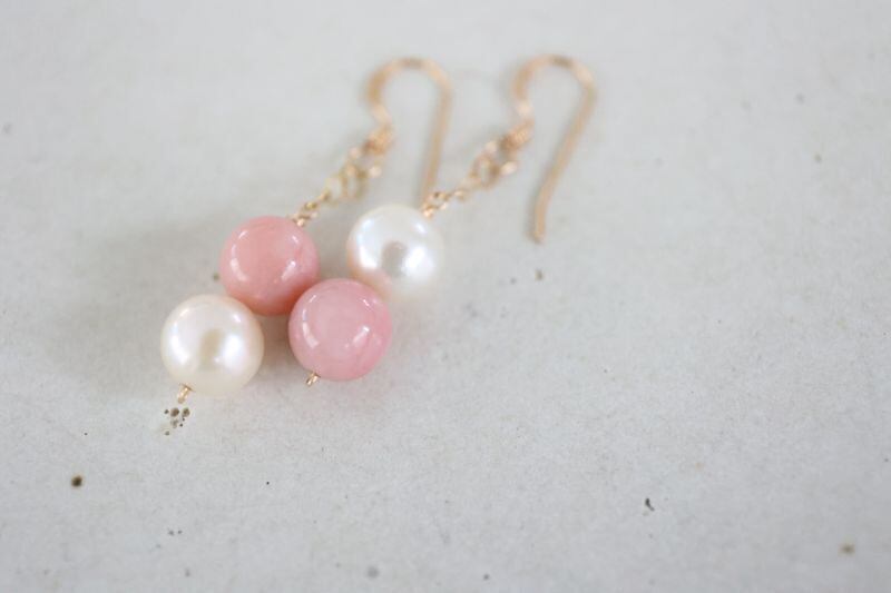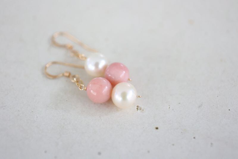 まるでイチゴミルクのようなカラーが愛らしいピンクオパールと、純白のパールを合わせたピアスです。