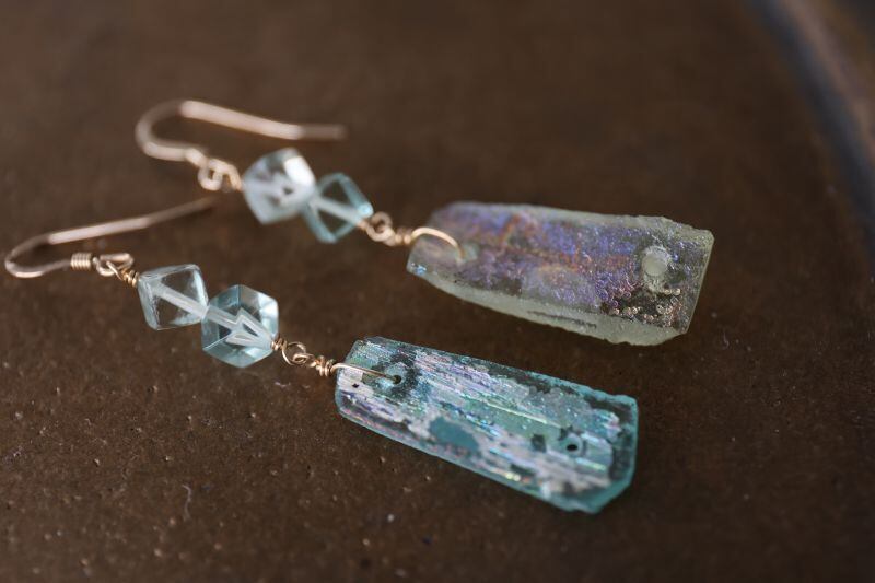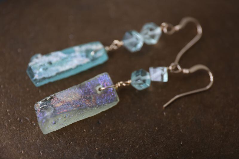 透明感のあるキューブ型のフローライトが、ローマンガラスの美しさを引き立てています。