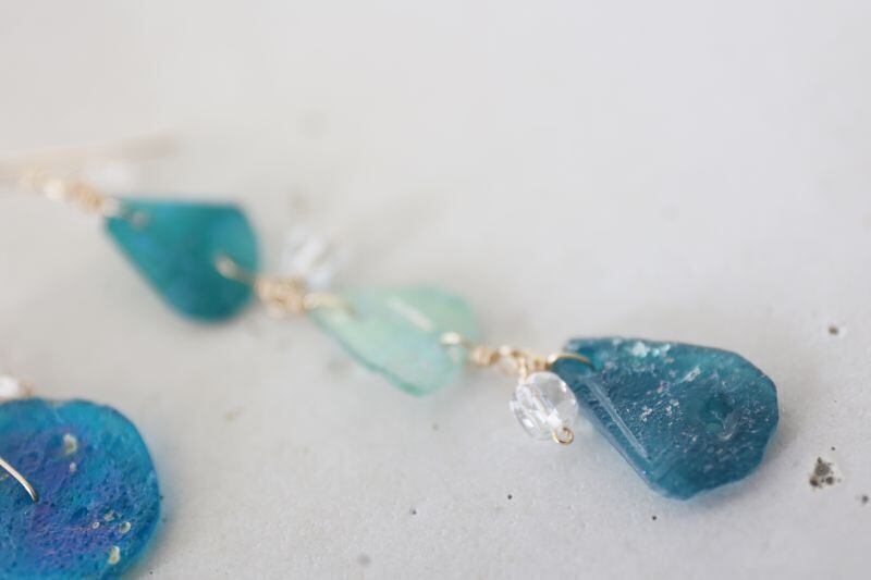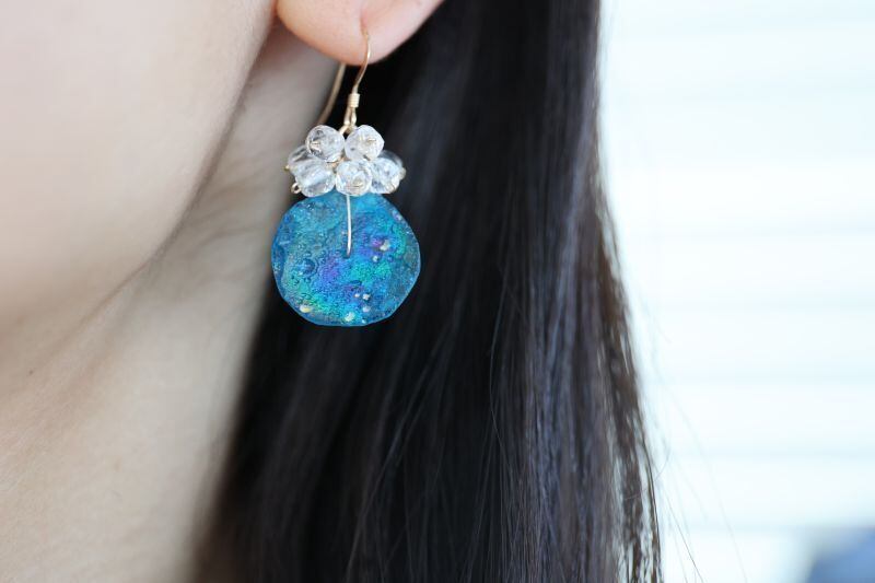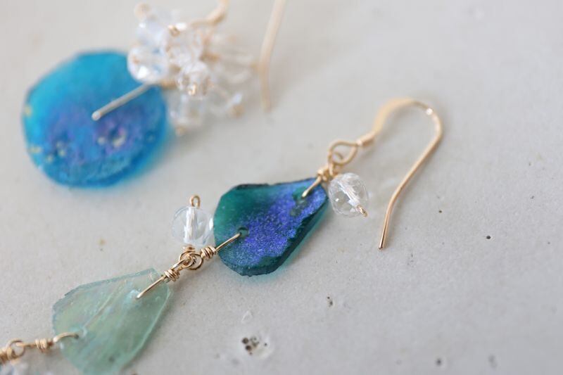 ガラスは、形も虹色の銀化部分も、ひとつひとつ全て違いますので、どのピアスも一点物。