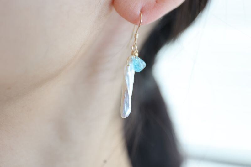 宝石質のアパタイトと、すっきり縦長の淡水パールの組合せです。