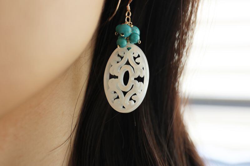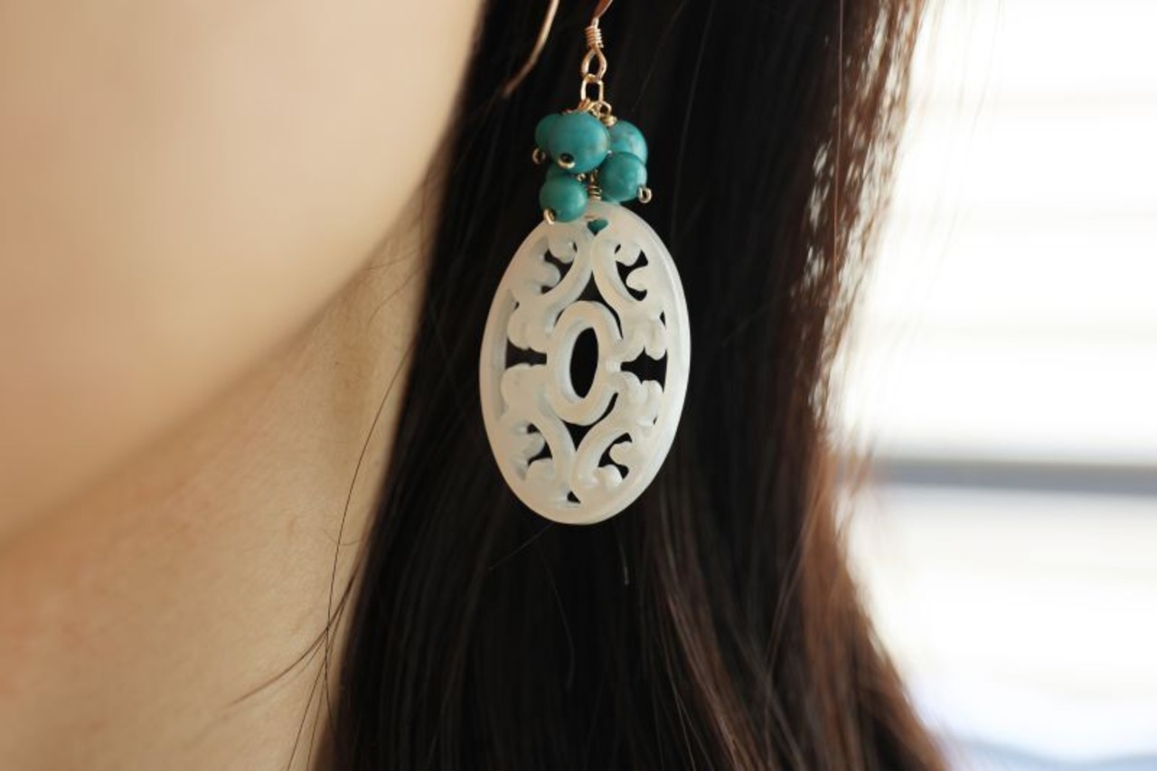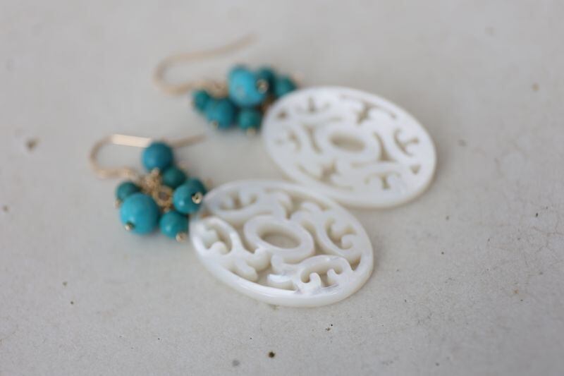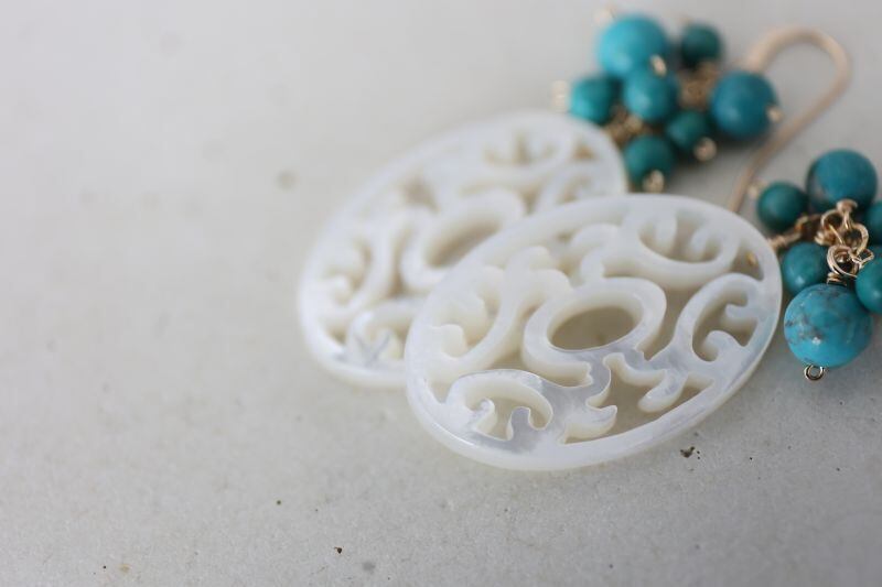 透かし彫りが優美な白蝶貝とターコイズのピアス。