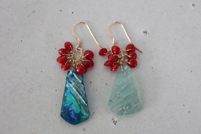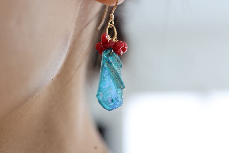 深紅の珊瑚(染め)が、ローマンガラスの美しさを引き立てています。