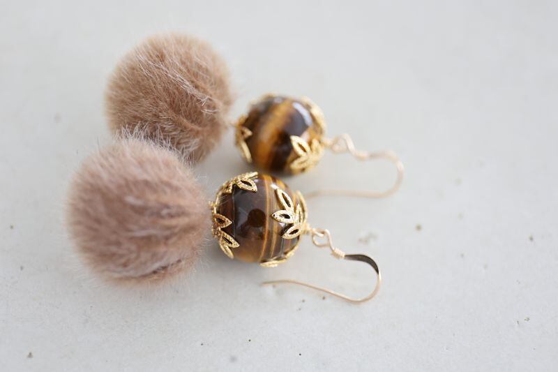 14mmの大粒のタイガーアイに金色の花座をプラスして、ブラウン系のフェイクファーと合わせました。