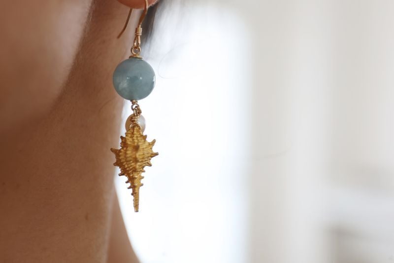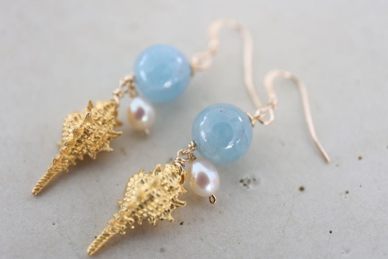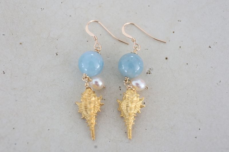 存在感のある10mmのアクアマリンに、ゴールドの巻き貝とパールを添えて、