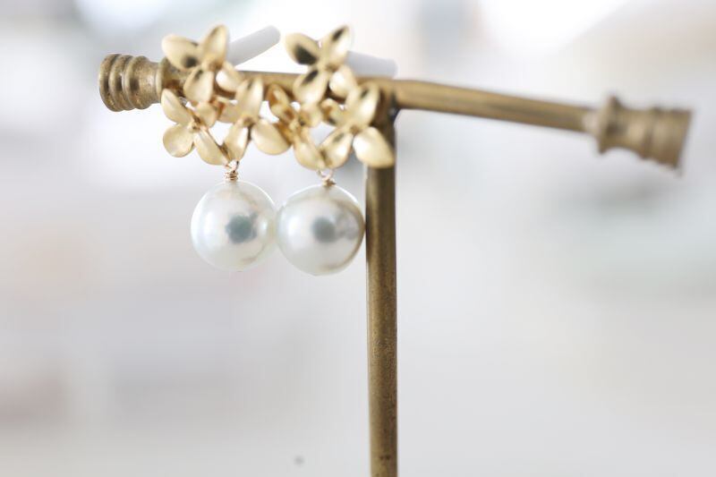 華やかなお花パーツにも負けない、淡いグレーのパールは9mm珠ですので、