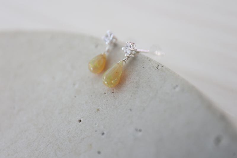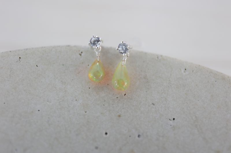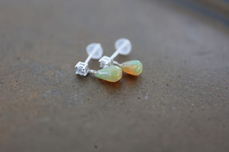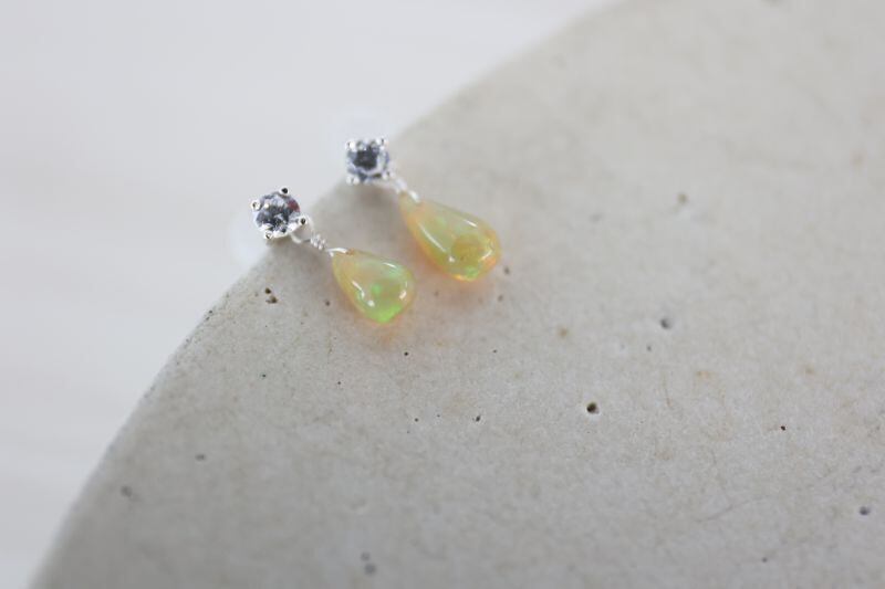 虹色の煌めきが美しいオパールをひと粒ずつ。控え目でいながら、しっかり自己主張するピアスです。