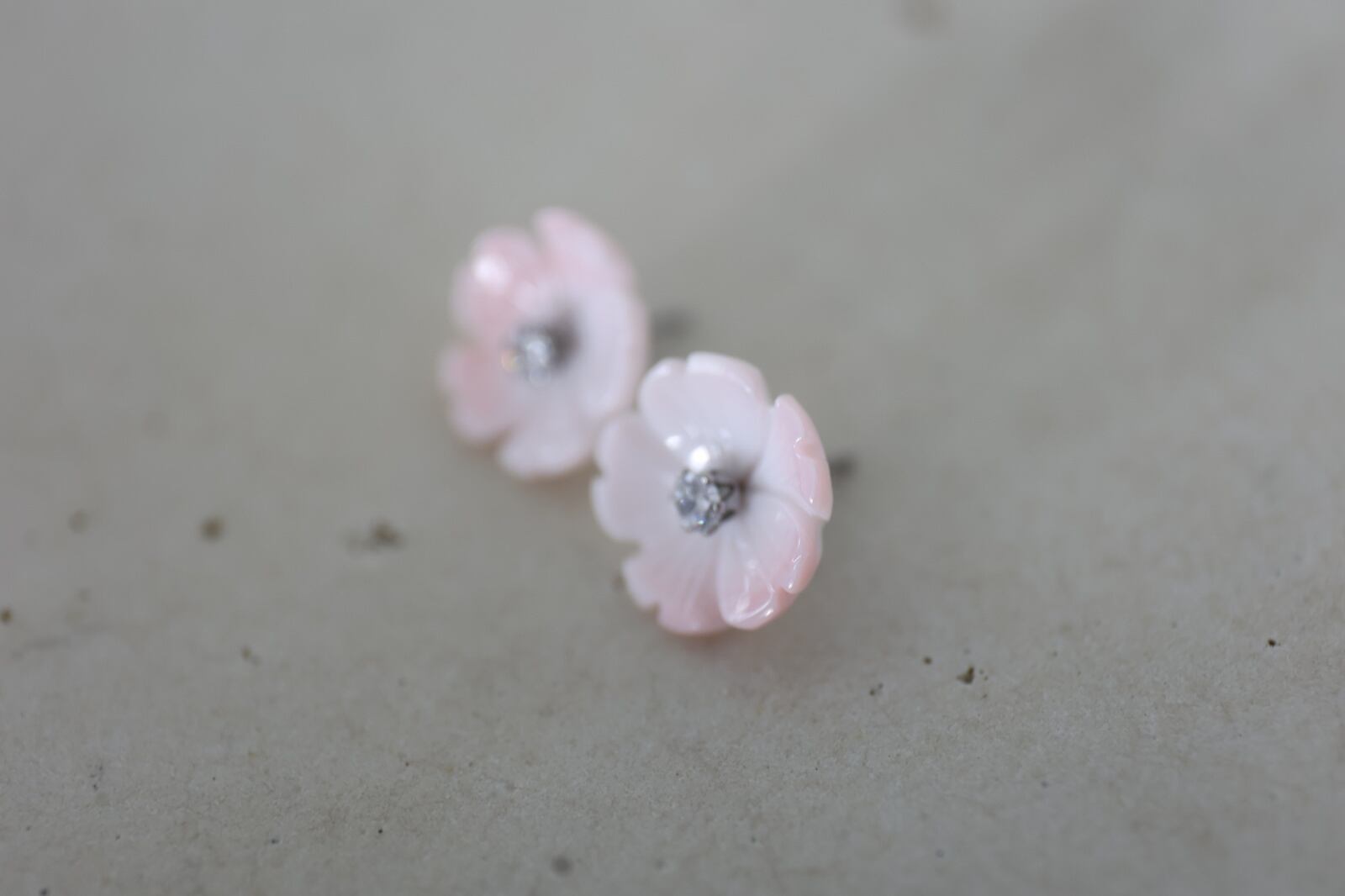 バハマ諸島産のクィーンコンクシェルから作られた、淡いピンクの桜花のピアス。