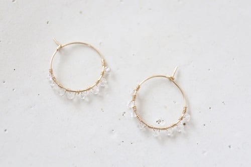 宝石質ホワイトトパーズのボタンカットをぐるぐるとフープに繋ぎました。