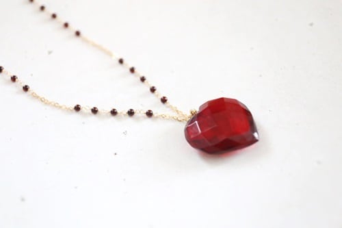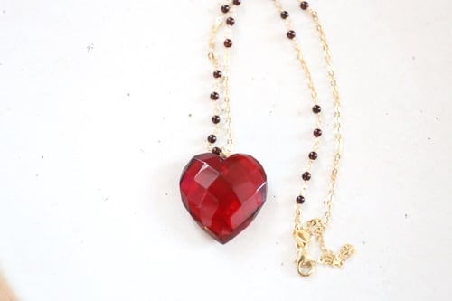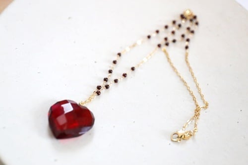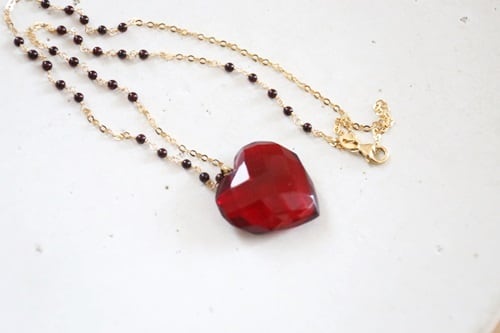 ファセットカットが美しいハートの琥珀は、この秋冬のトレンドカラー、深紅。