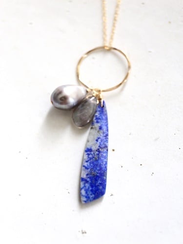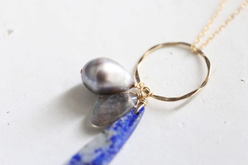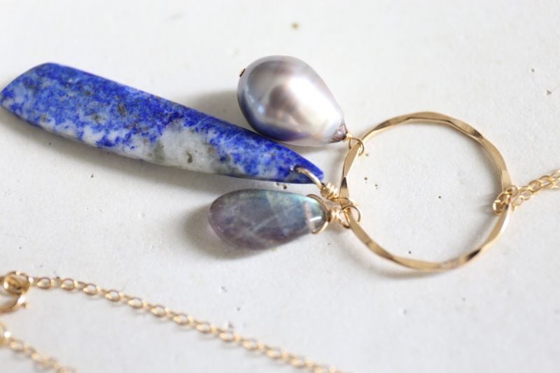 3つの天然石を14kgfのリングにあしらったネックレスです。