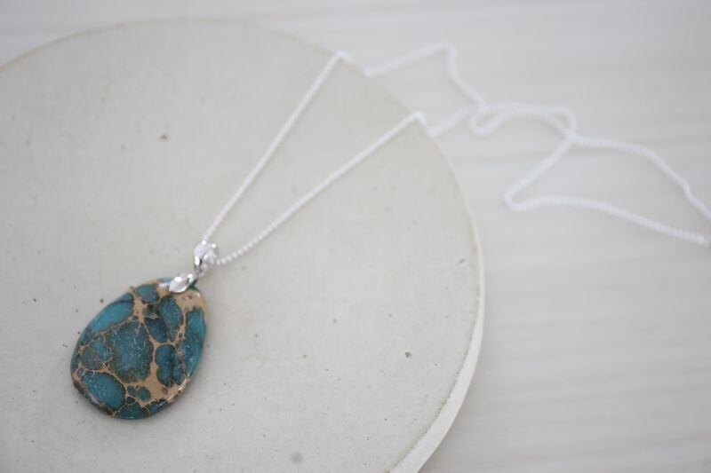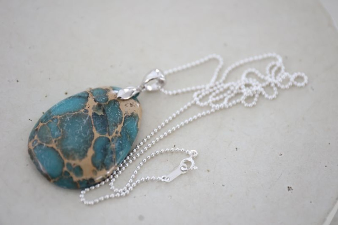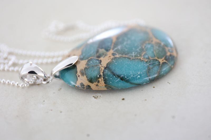 インプレッションジャスパーは、翡翠色の中にベージュやブラウンの絵画のような模様や網目の模様が入った芸術的な天然石です。