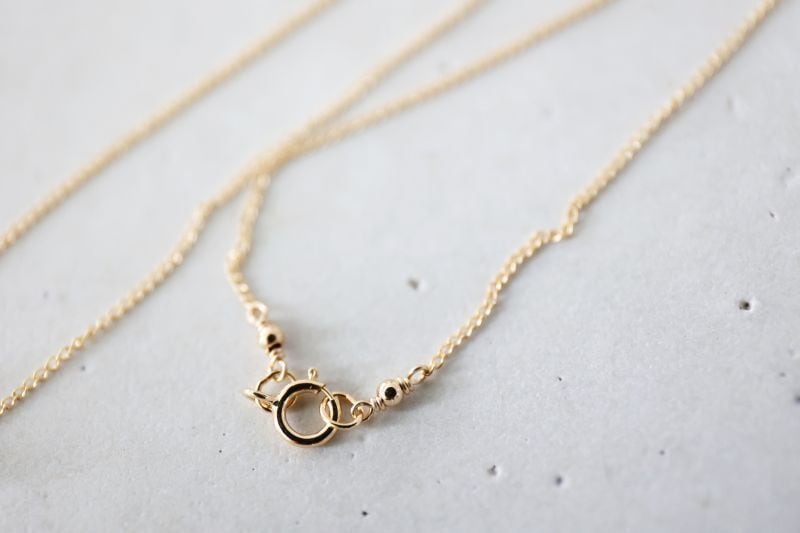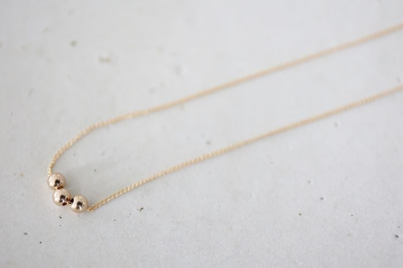 4mmの14KGF製のビーズを3粒、華奢なチェーンに通した、ごくシンプルなネックレスです。
