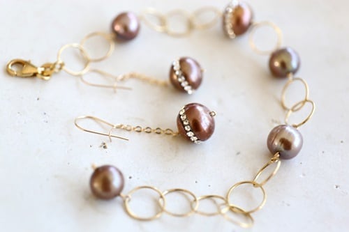 ピアスは、ブレスレットと同じジルコニア入りのブラウンパールで、きらきらと耳元で輝きます。