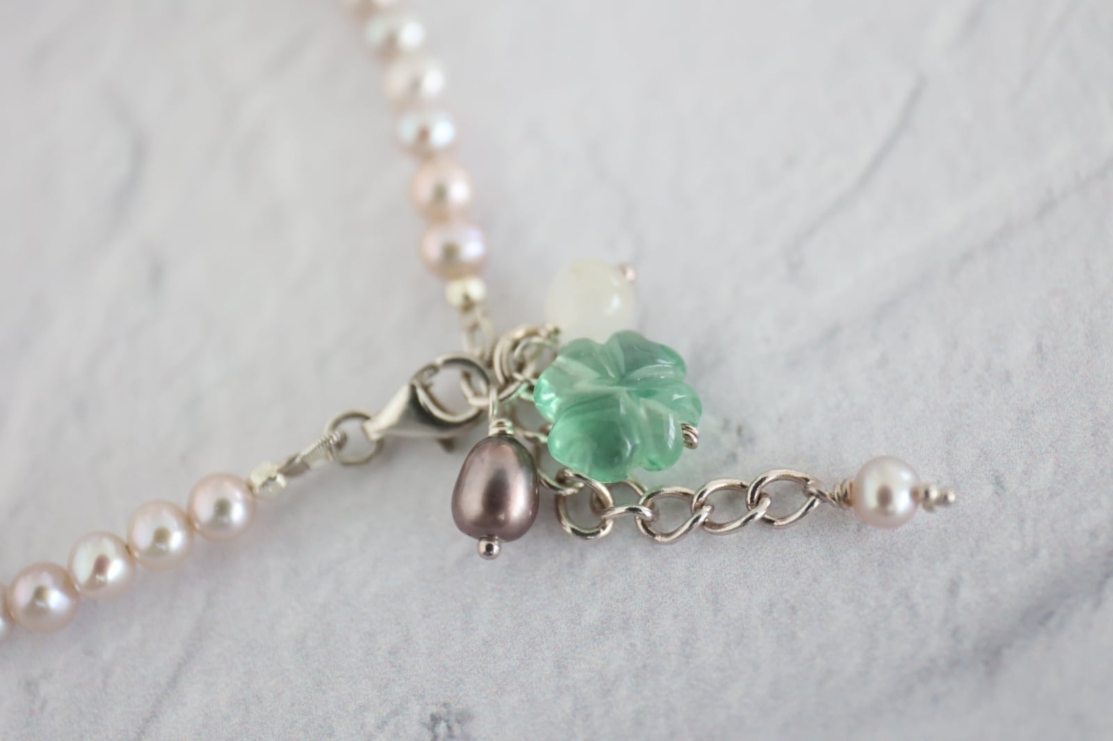 チャームは、幸せを運んでくれそうな四つ葉のクローバー形のフローライト、ムーンストーン、
