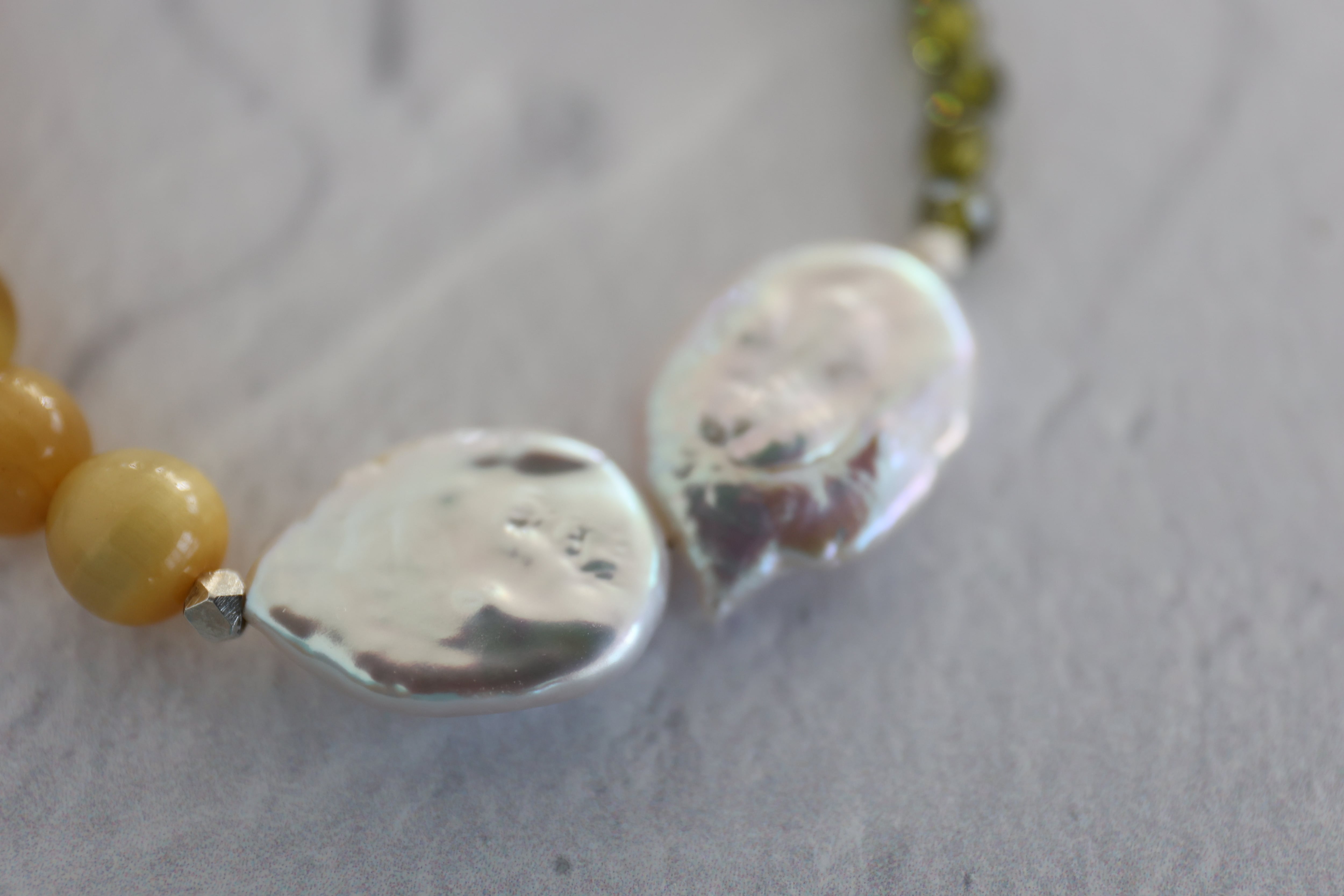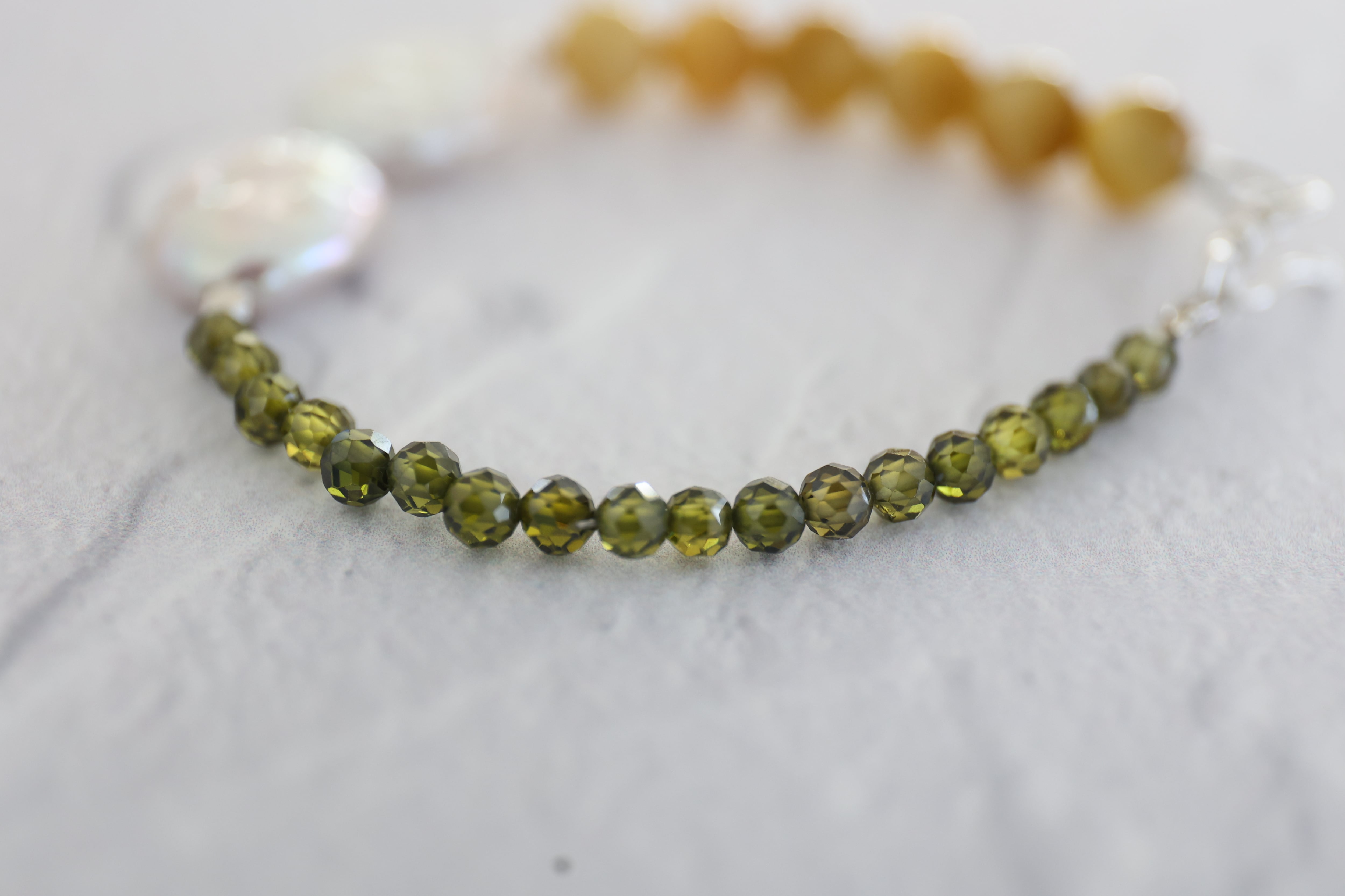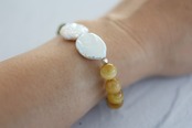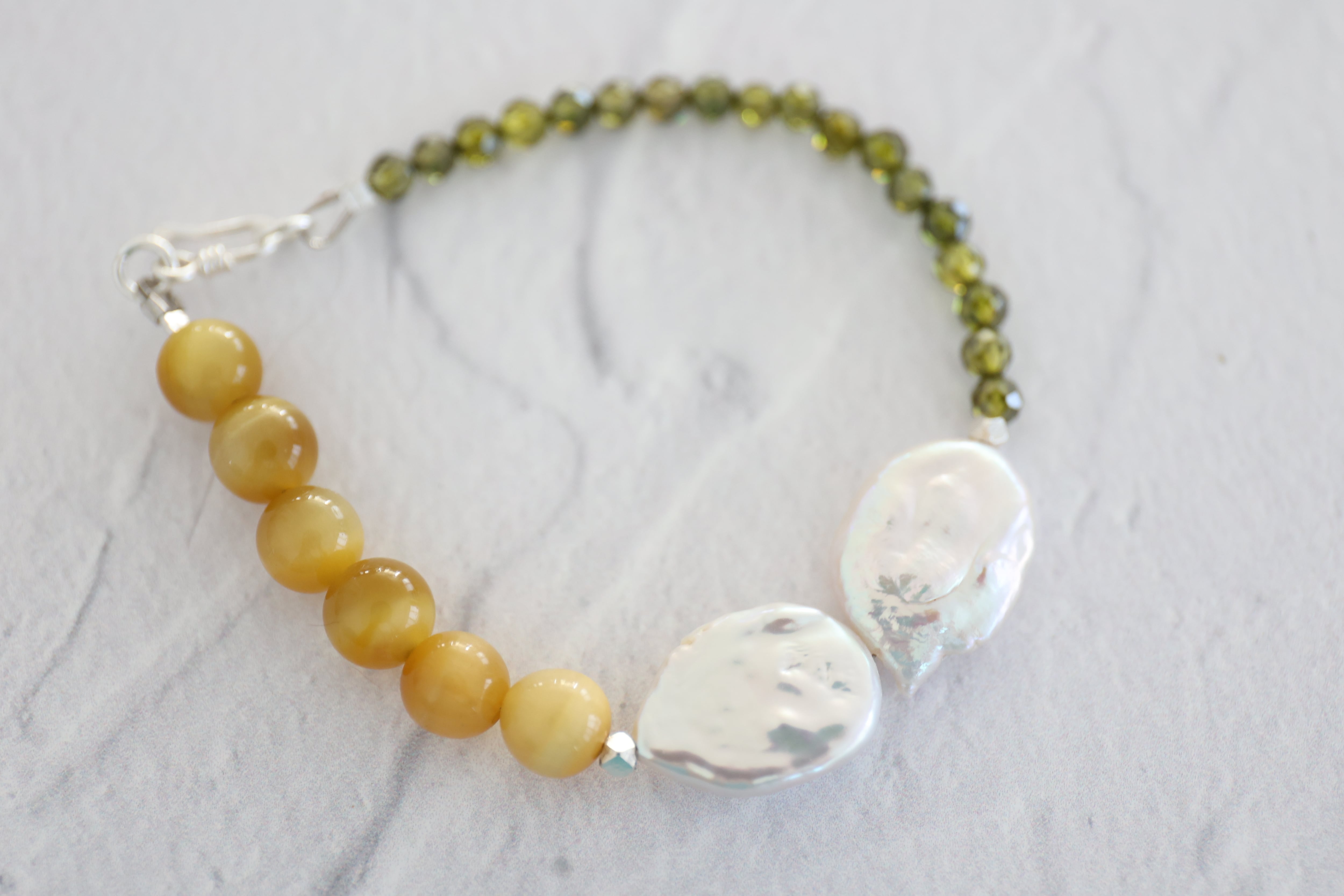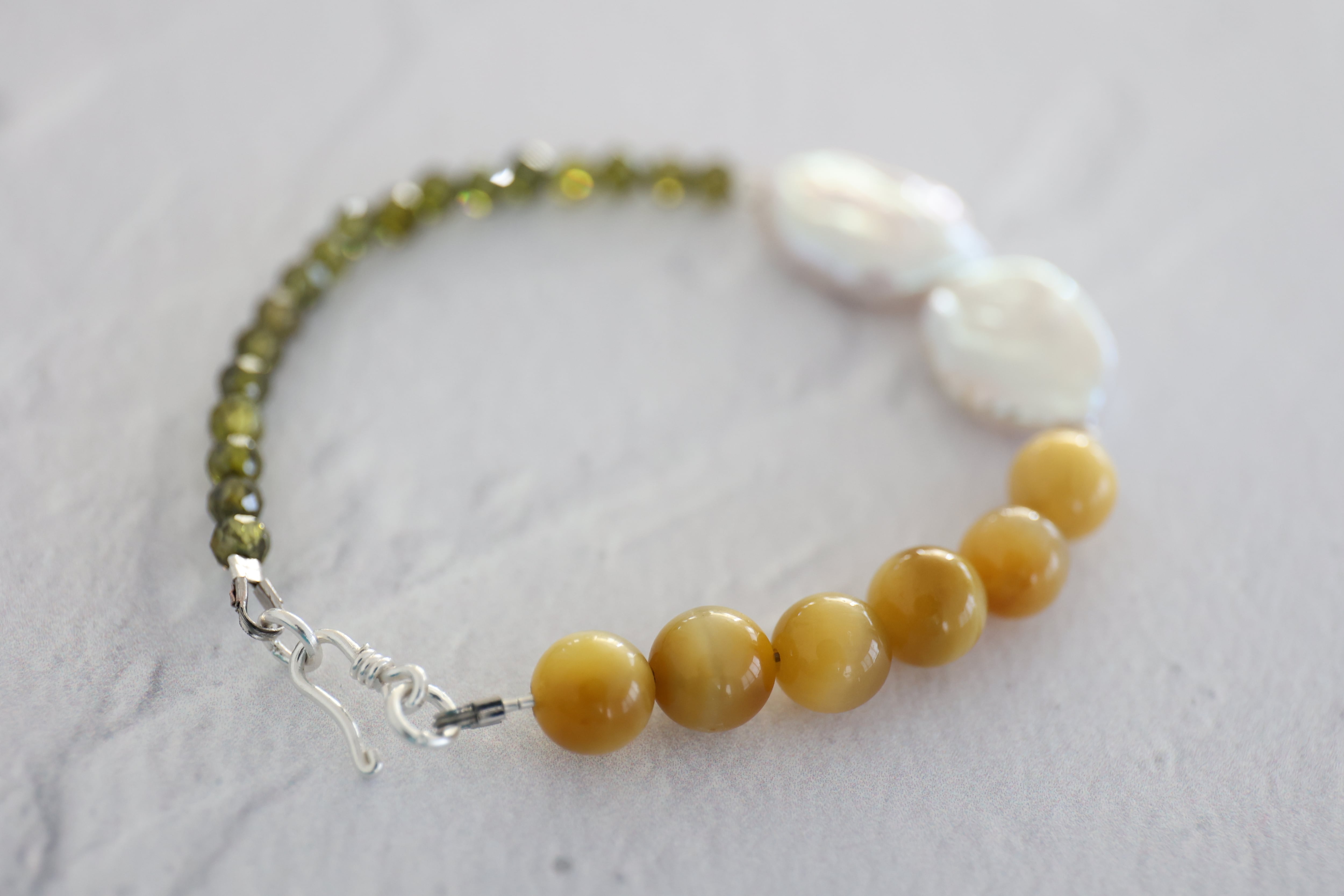 大粒の淡水パールを二粒あしらった、上品で秋らしいブレスレット。