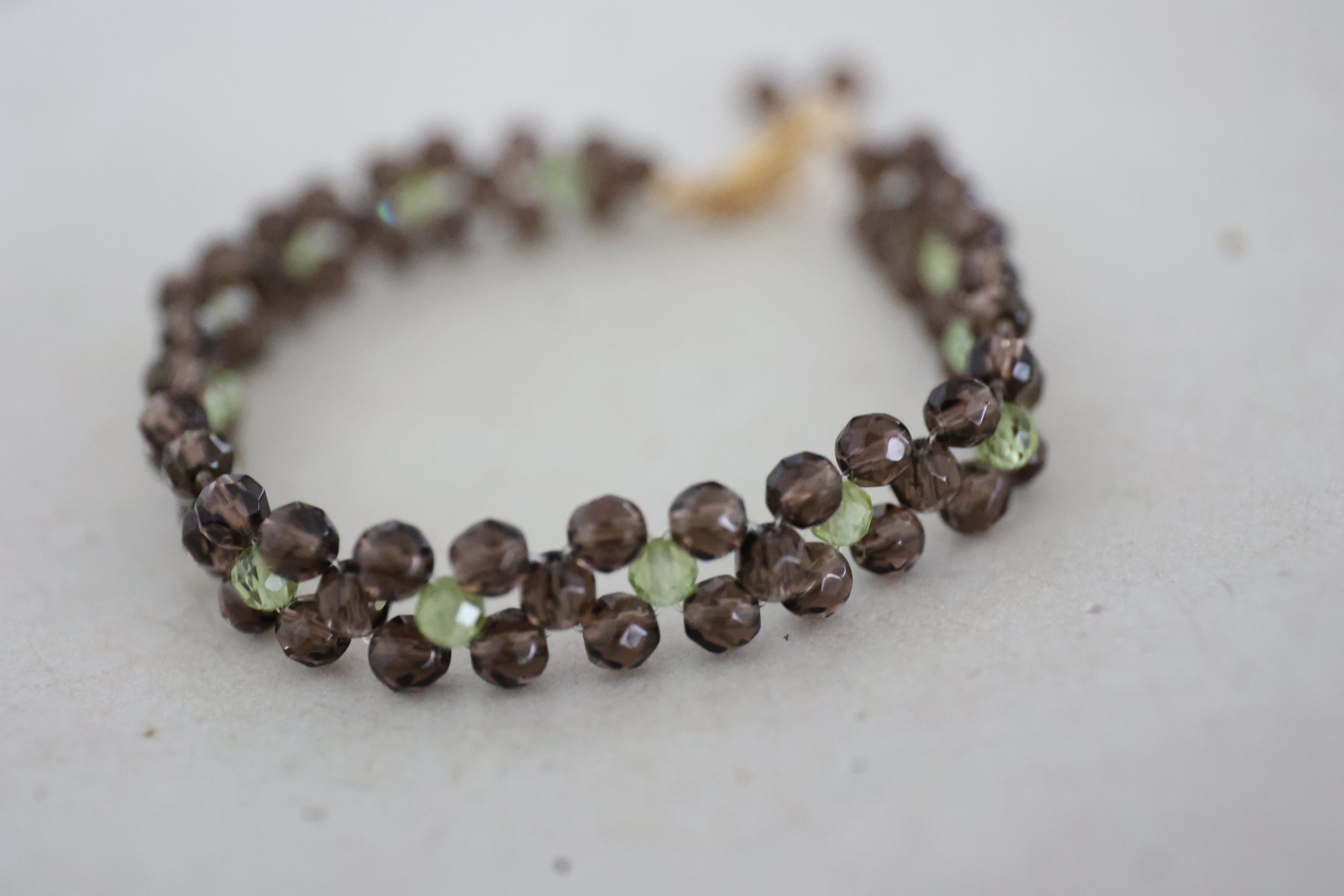 オリーブグリーンが美しいペリドットと、透明感に優れたスモーキークォーツを丁寧に編み込み、