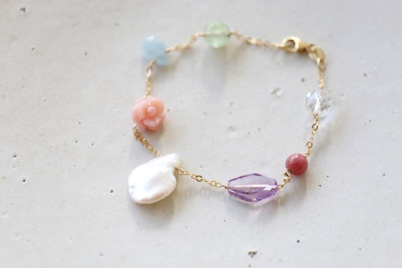 春をイメージした、ふんわりとやわらかい色彩のブレスレットです。