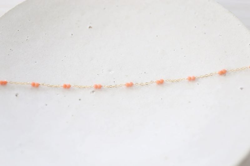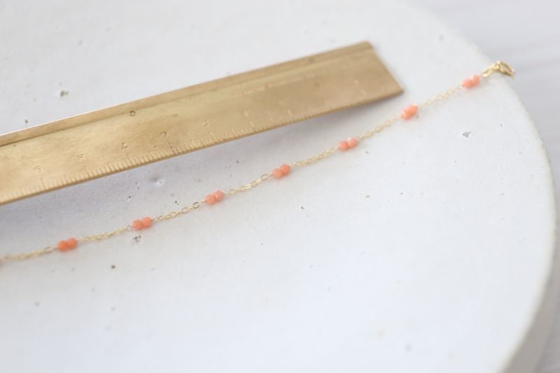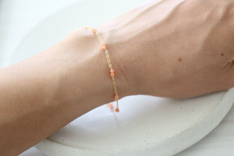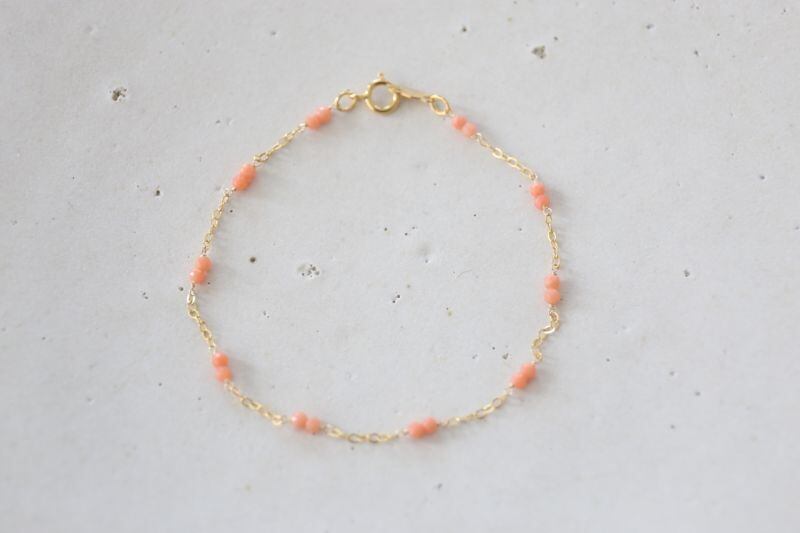 華奢な14KGFのチェーンに、2mmの小さなピンクコーラルを散らした、とても繊細なブレスレットです。