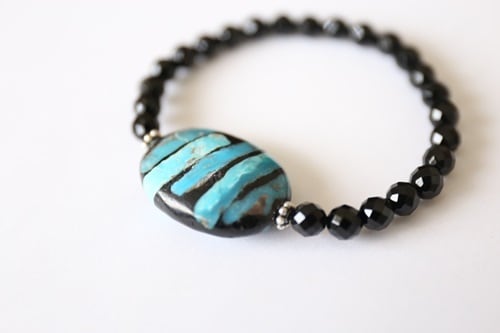 木の化石ジェットにターコイズを埋め込んだ、とても珍しい石です。
