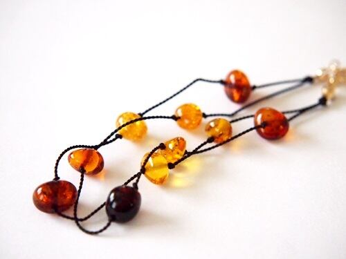 マルチカラーのコロンとした琥珀を、絹糸で繋いだブレスレットです。
