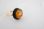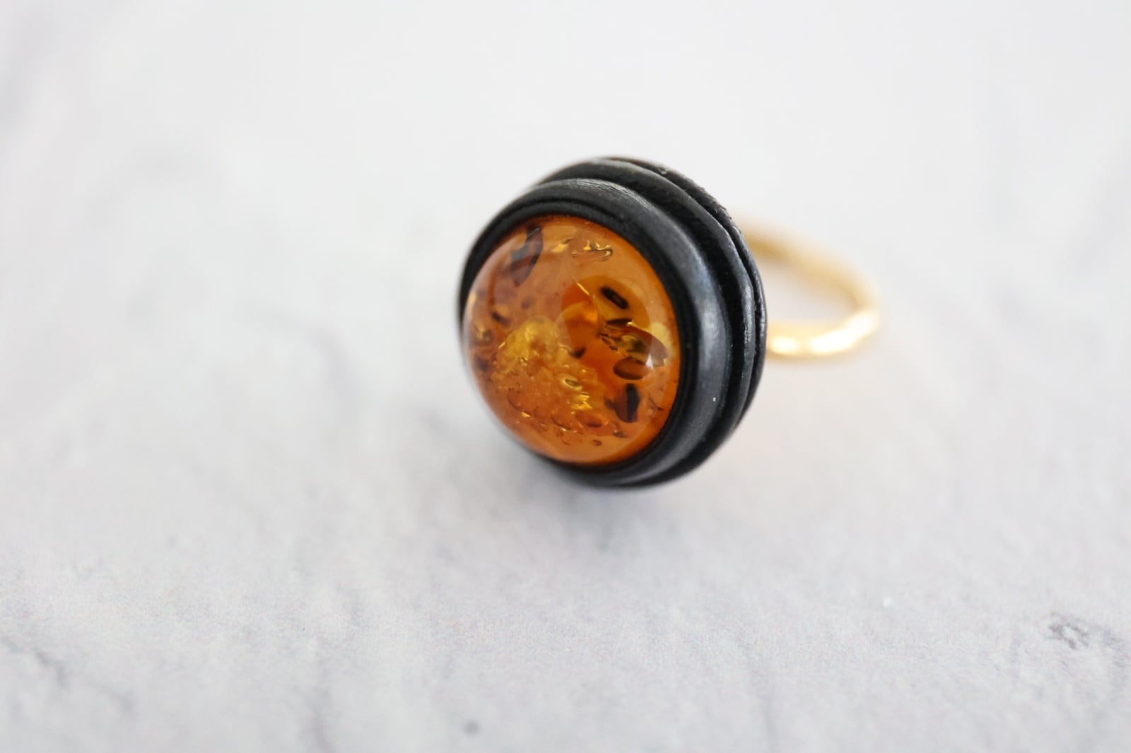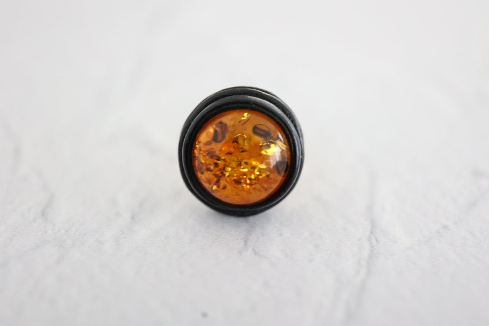 琥珀の周りには丁寧な革細工が施され、より高級感を高めています。皮革部分は水濡れに弱いので、十分ご留意ください。
