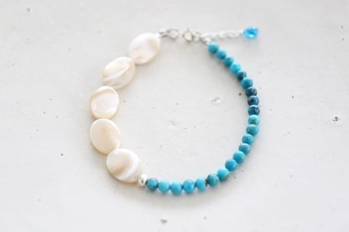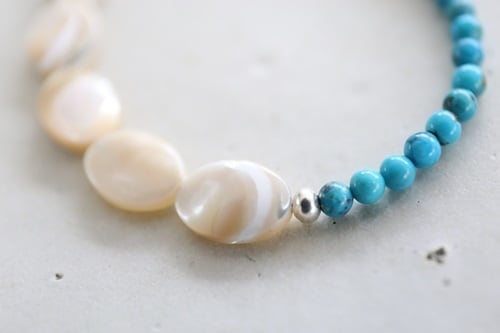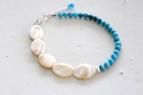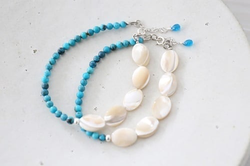 品のあうベージュカラーと爽やかなブルーとシルバーで夏仕様のブレスレットになります。