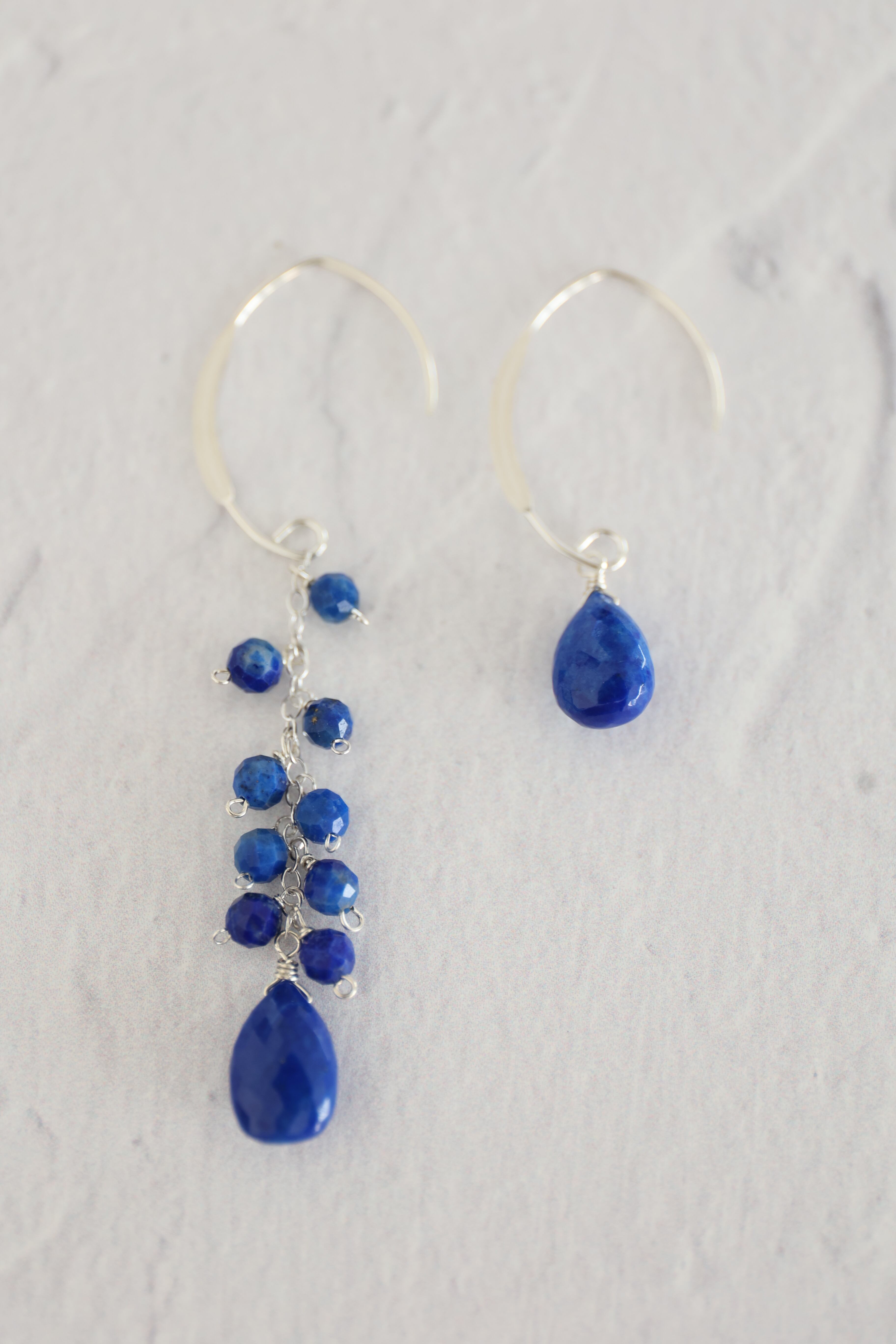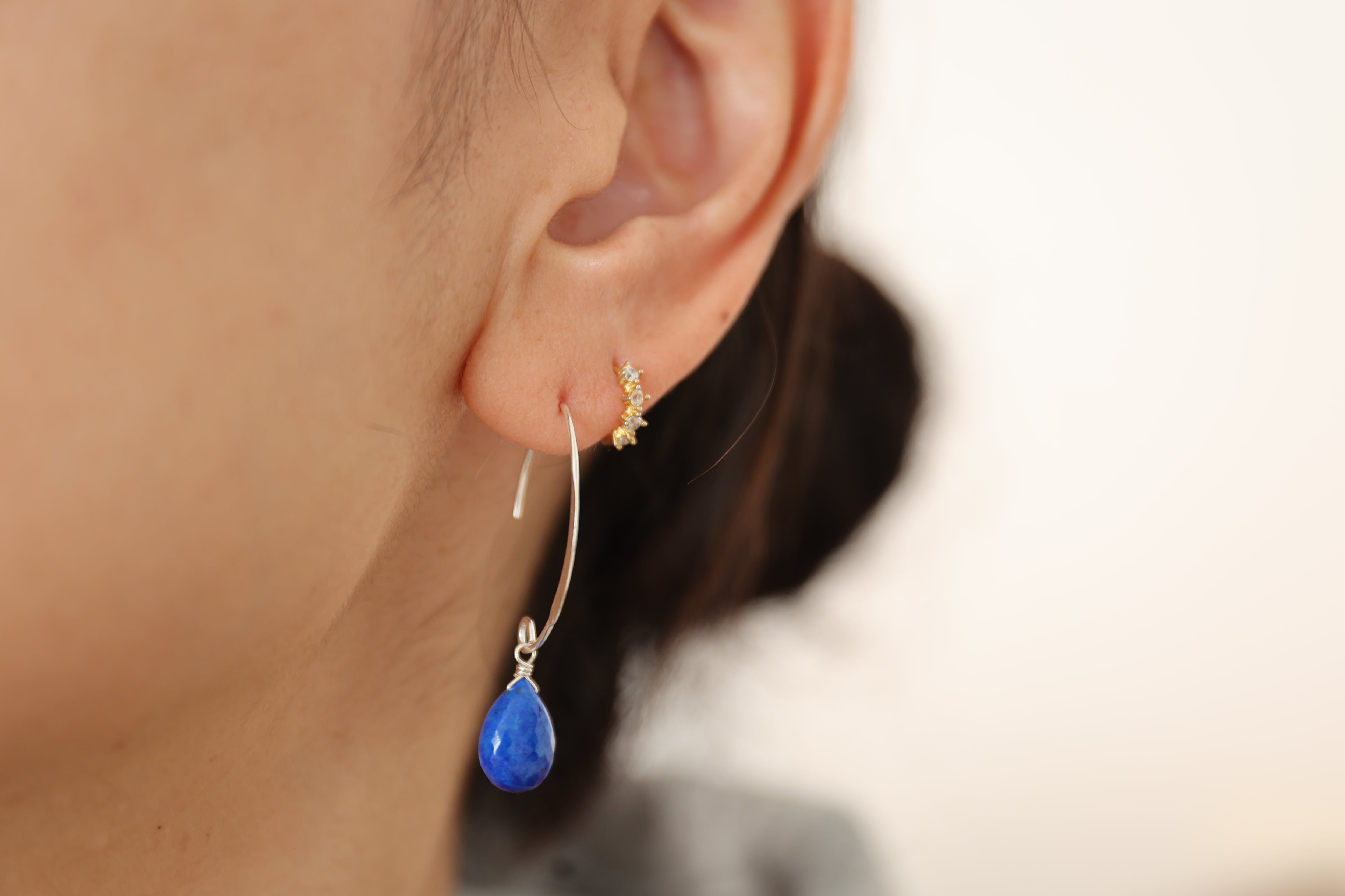 動くたびに深いブルーの中で光を反射し、耳元を印象的に彩ります。