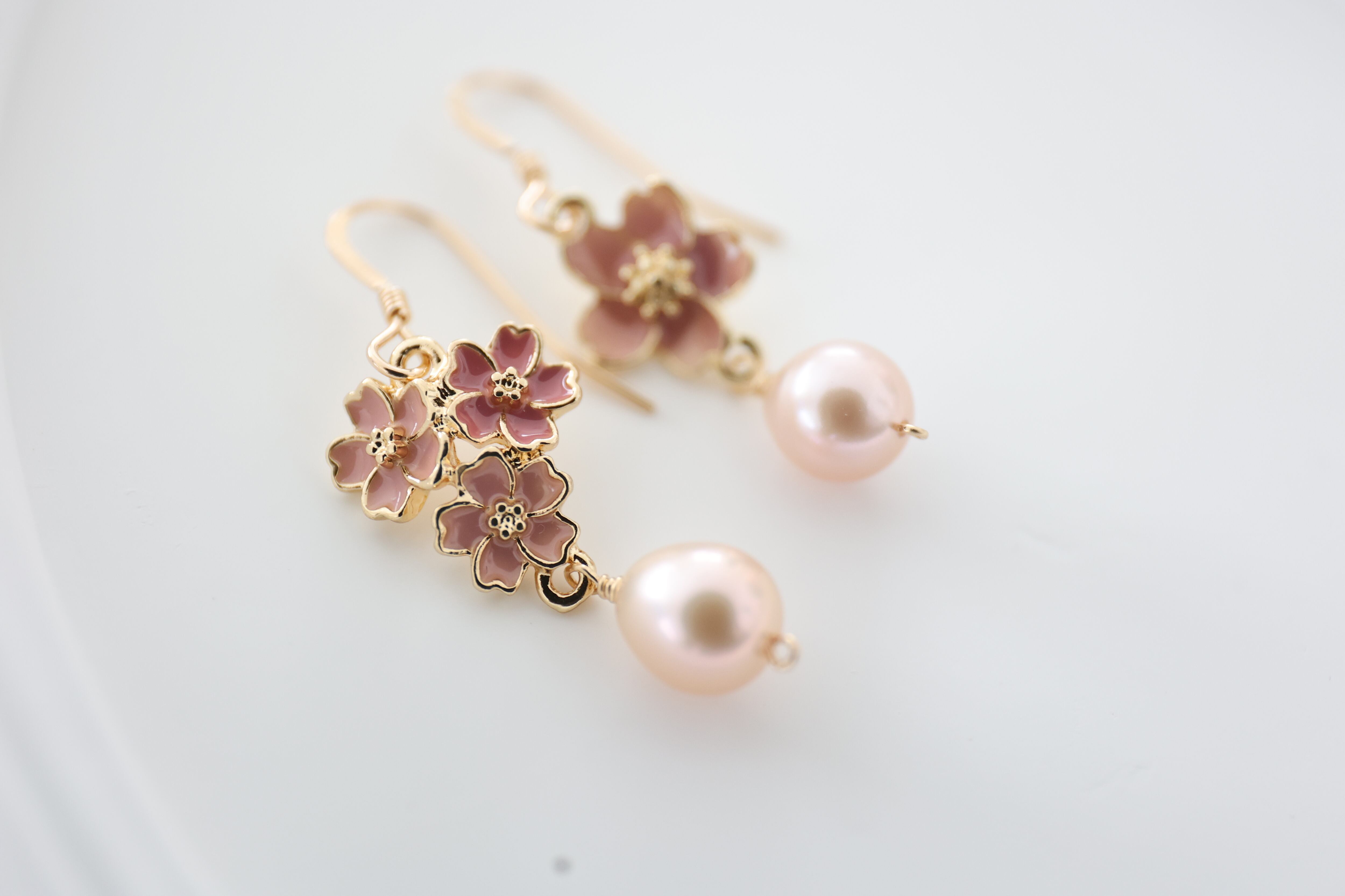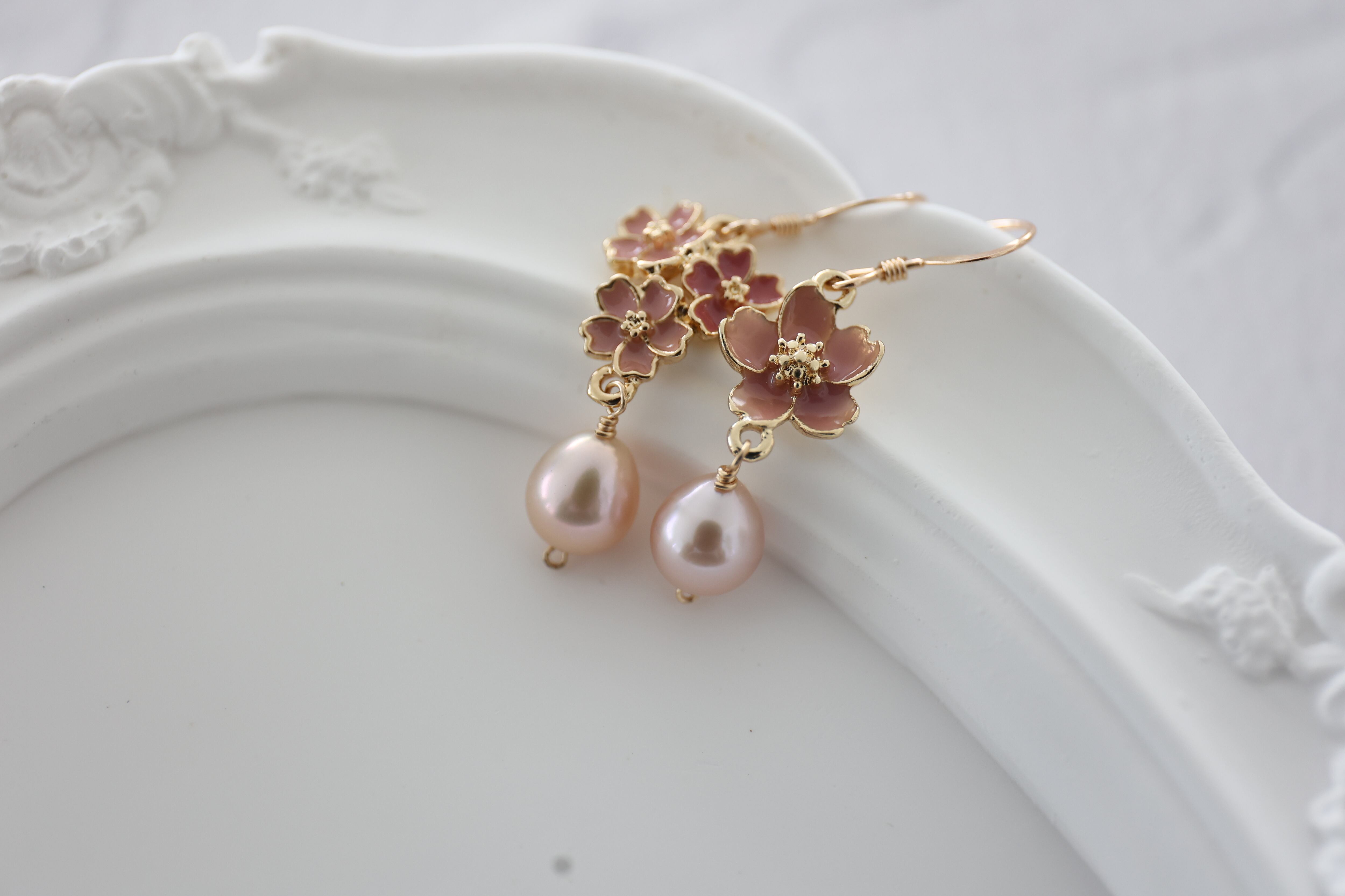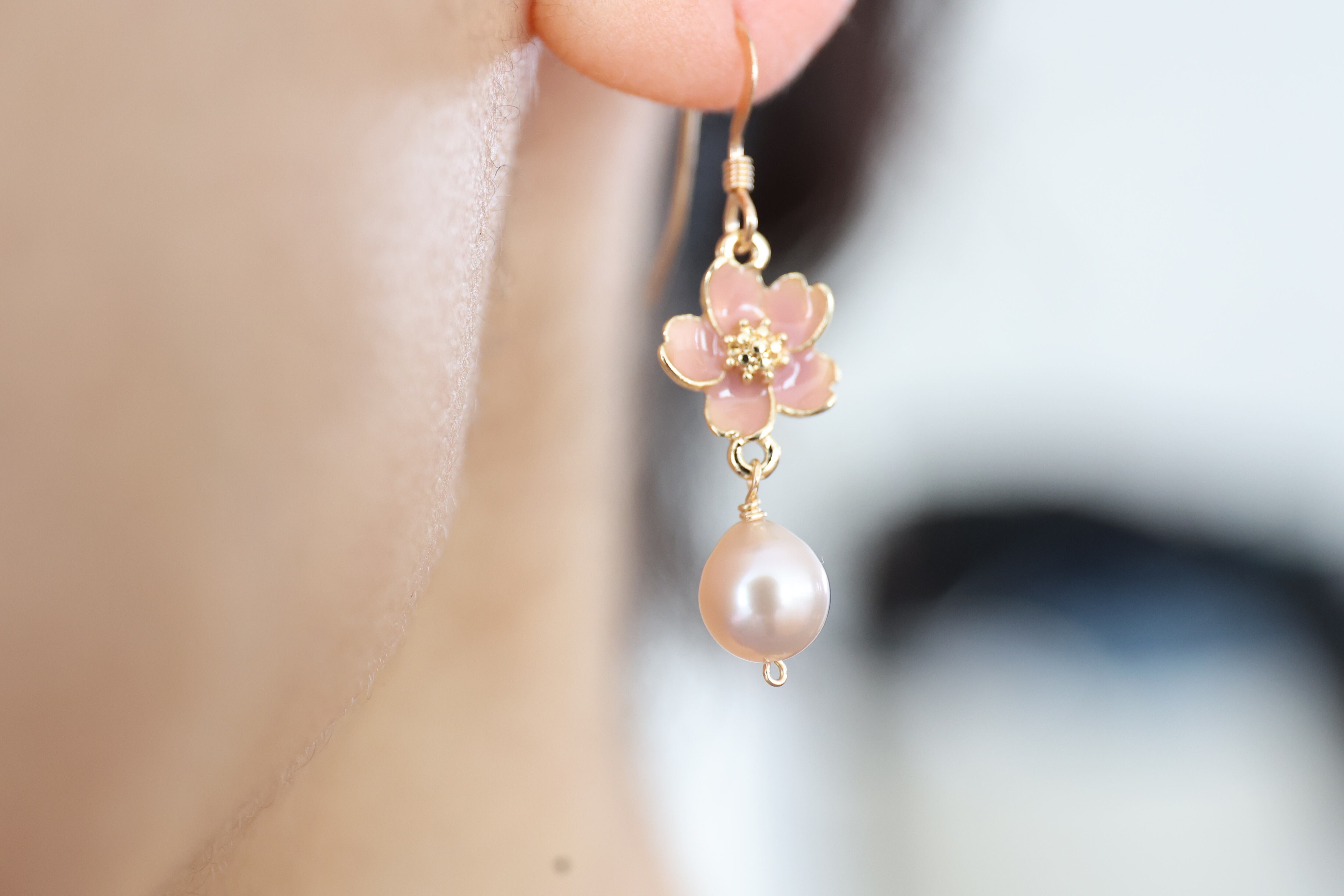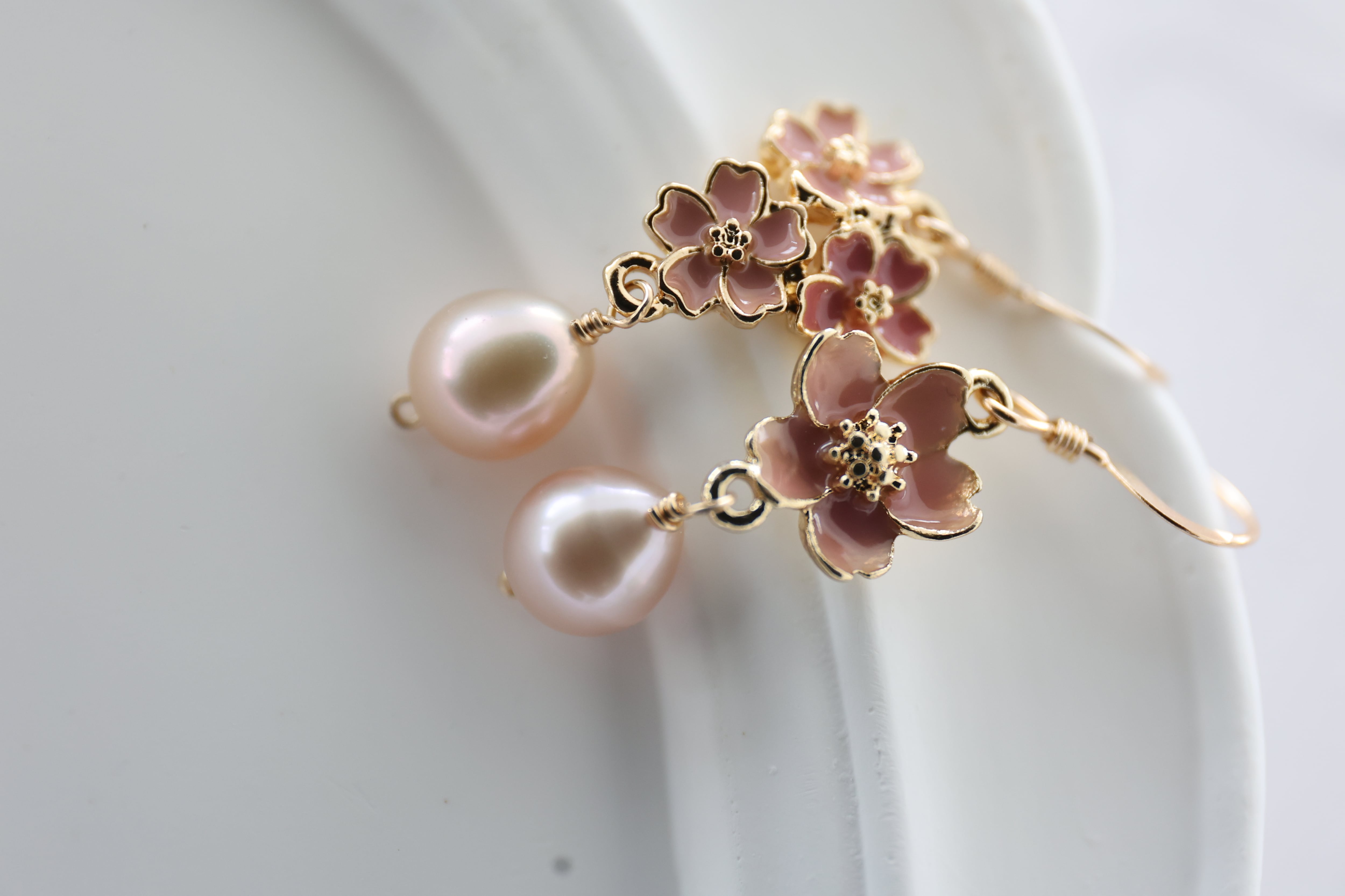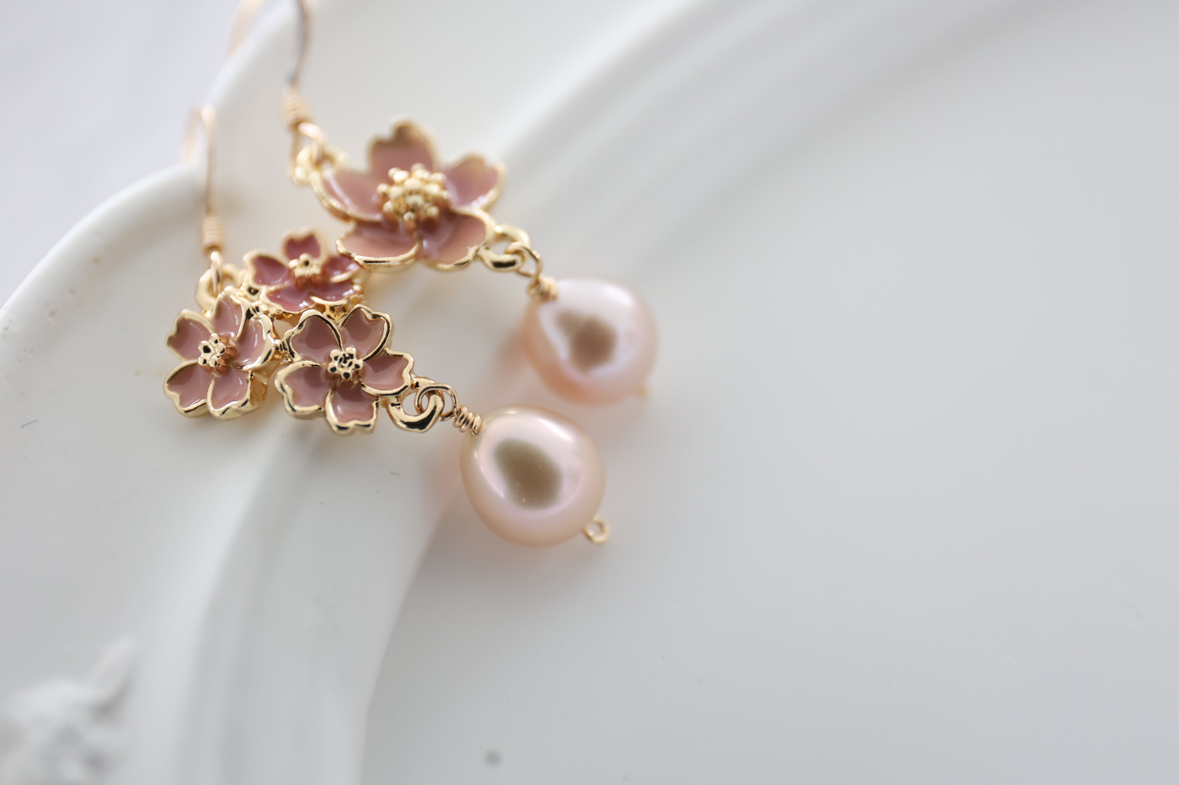 しずくの形と淡いピンクがなんとも愛らしい淡水パールを合わせました。