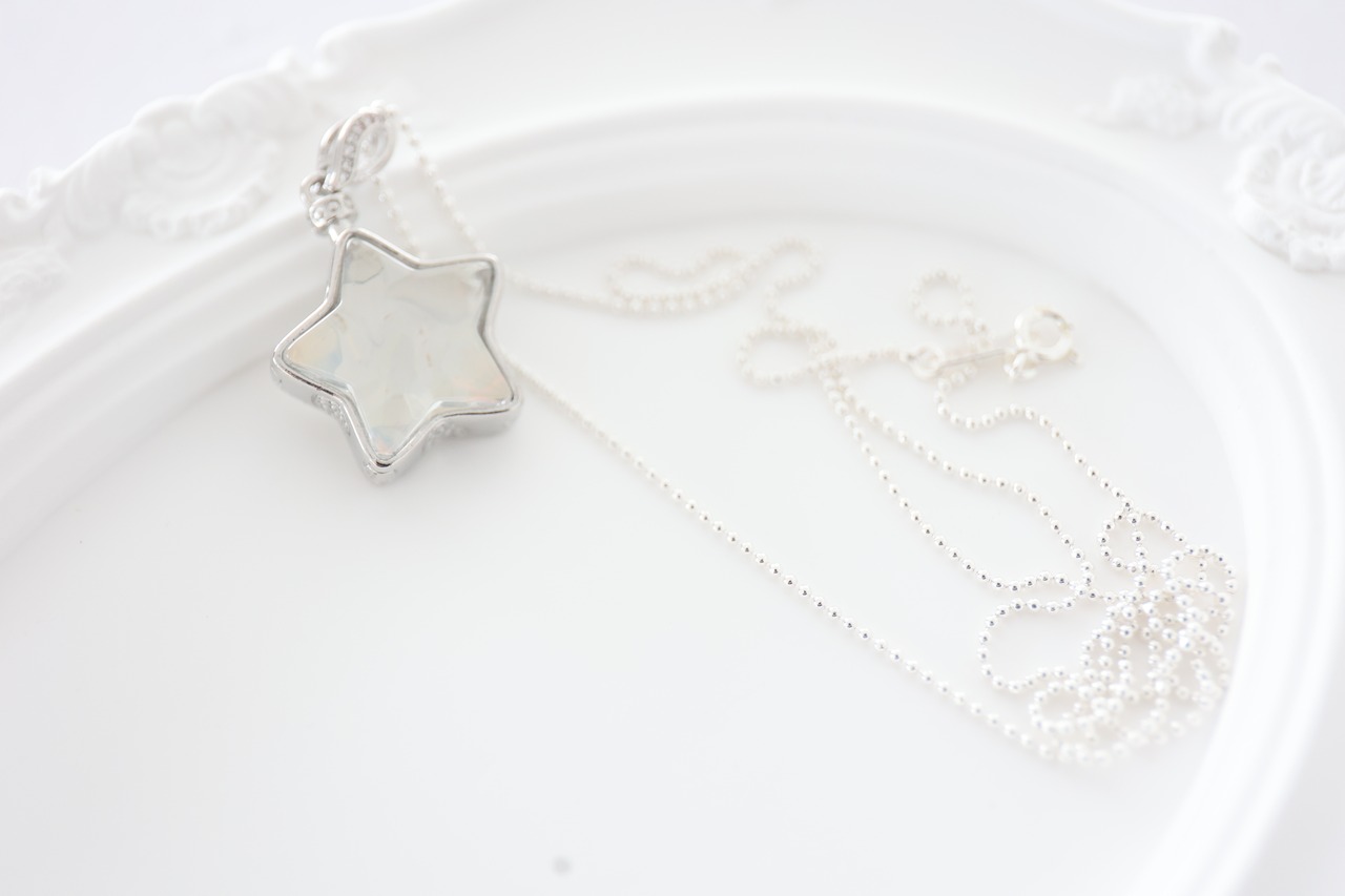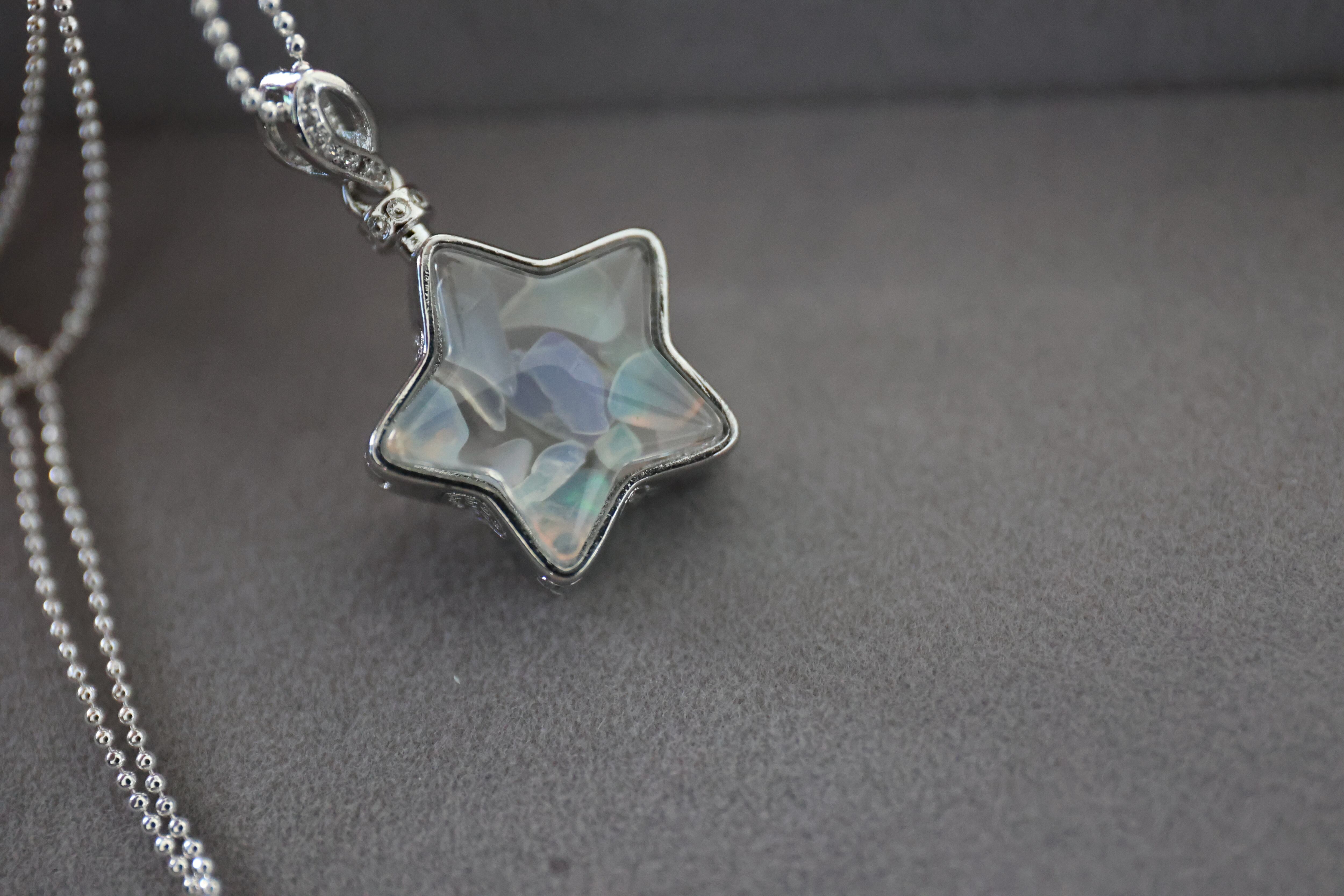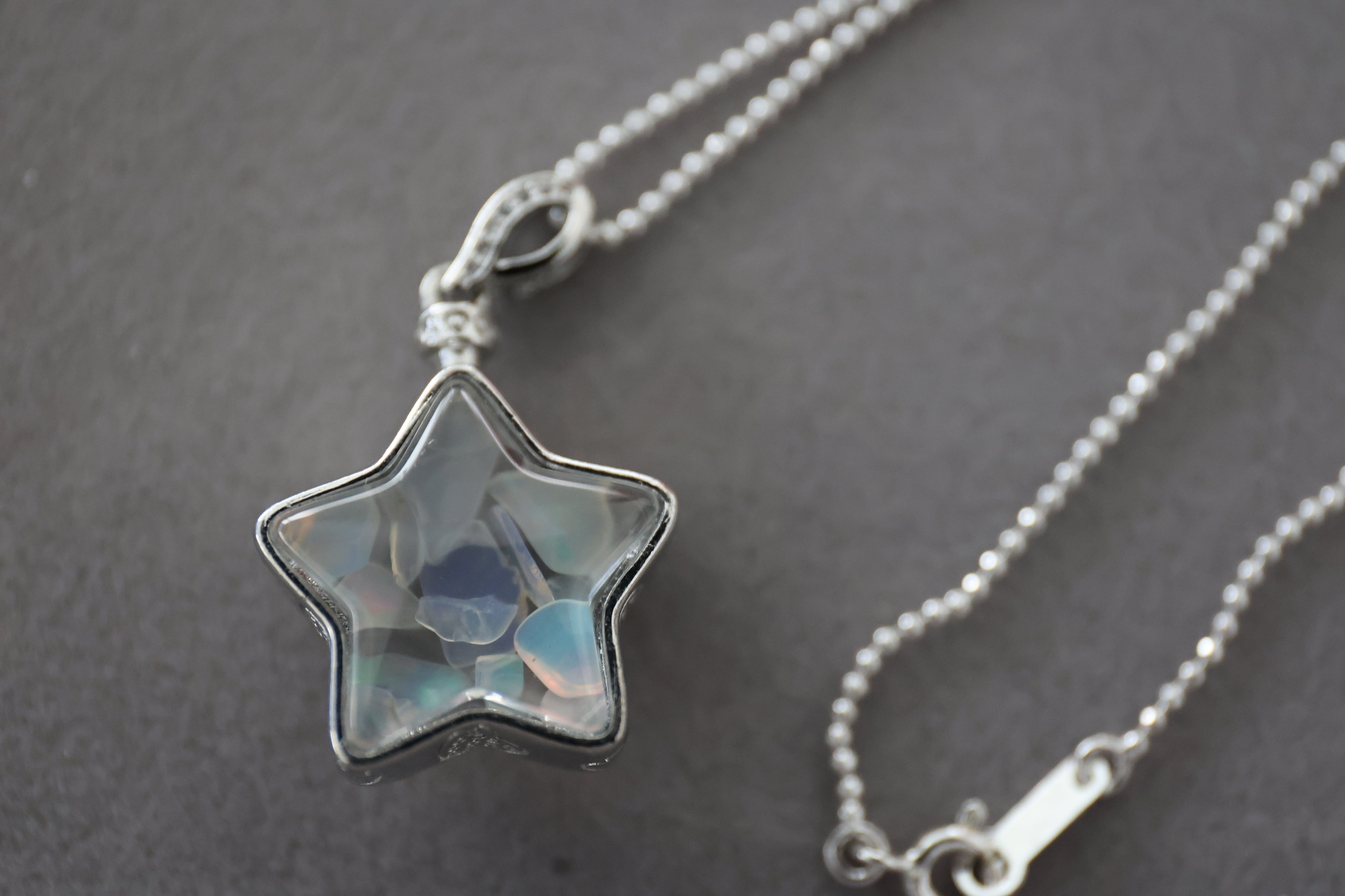 お星さまのモチーフの中に、エチオピア産プレシャスオパールを閉じ込めた、上品で遊び心のあるペンダント。