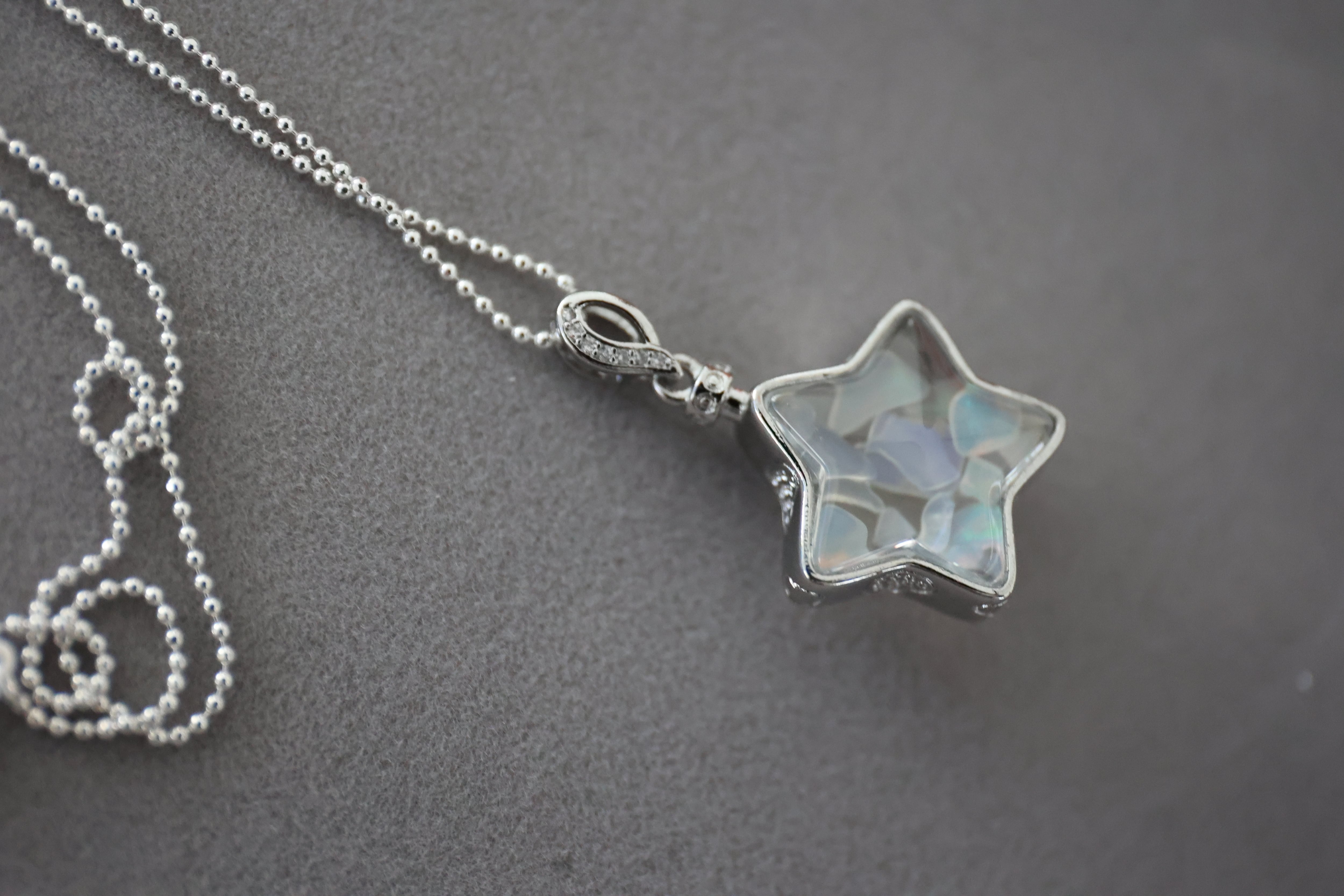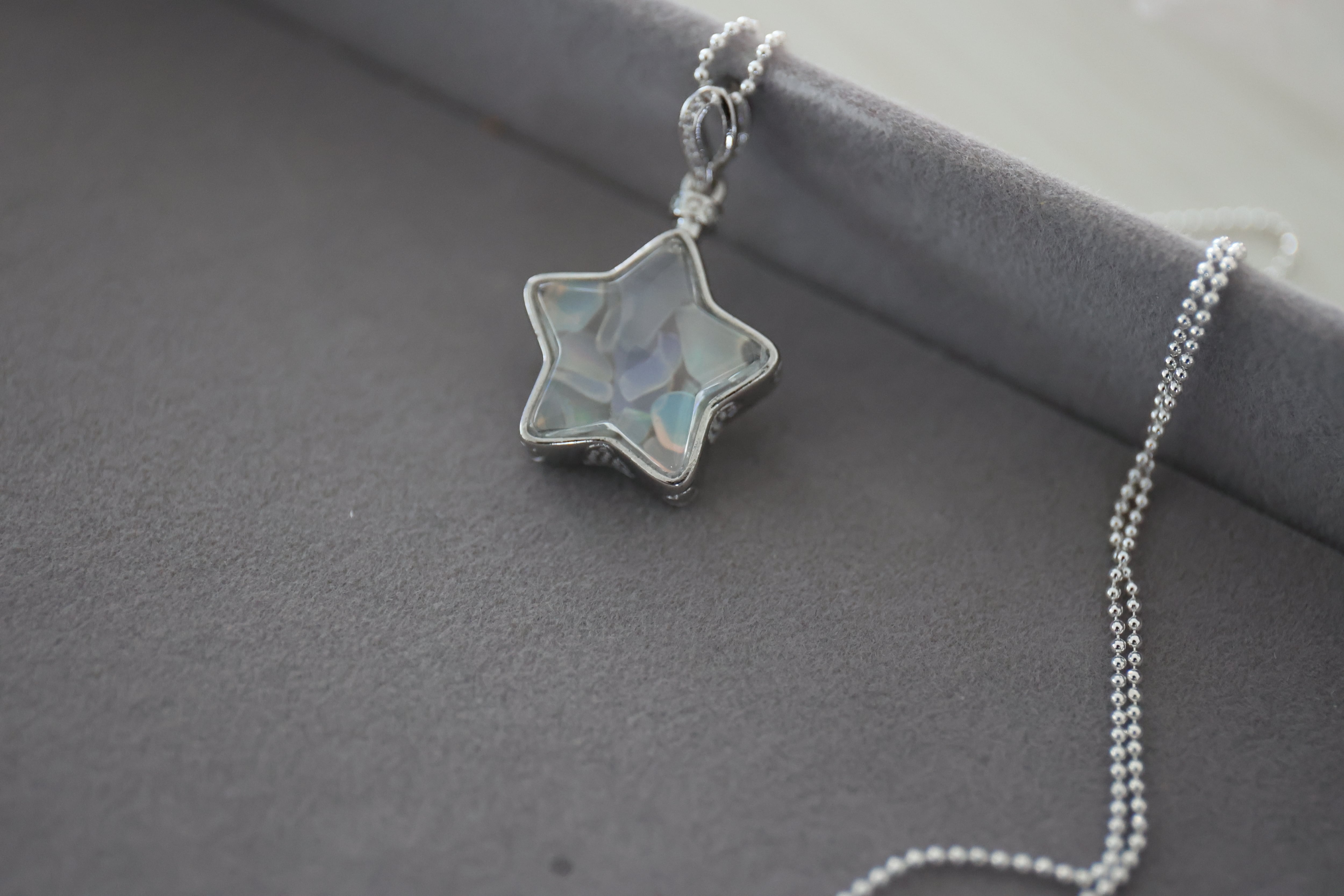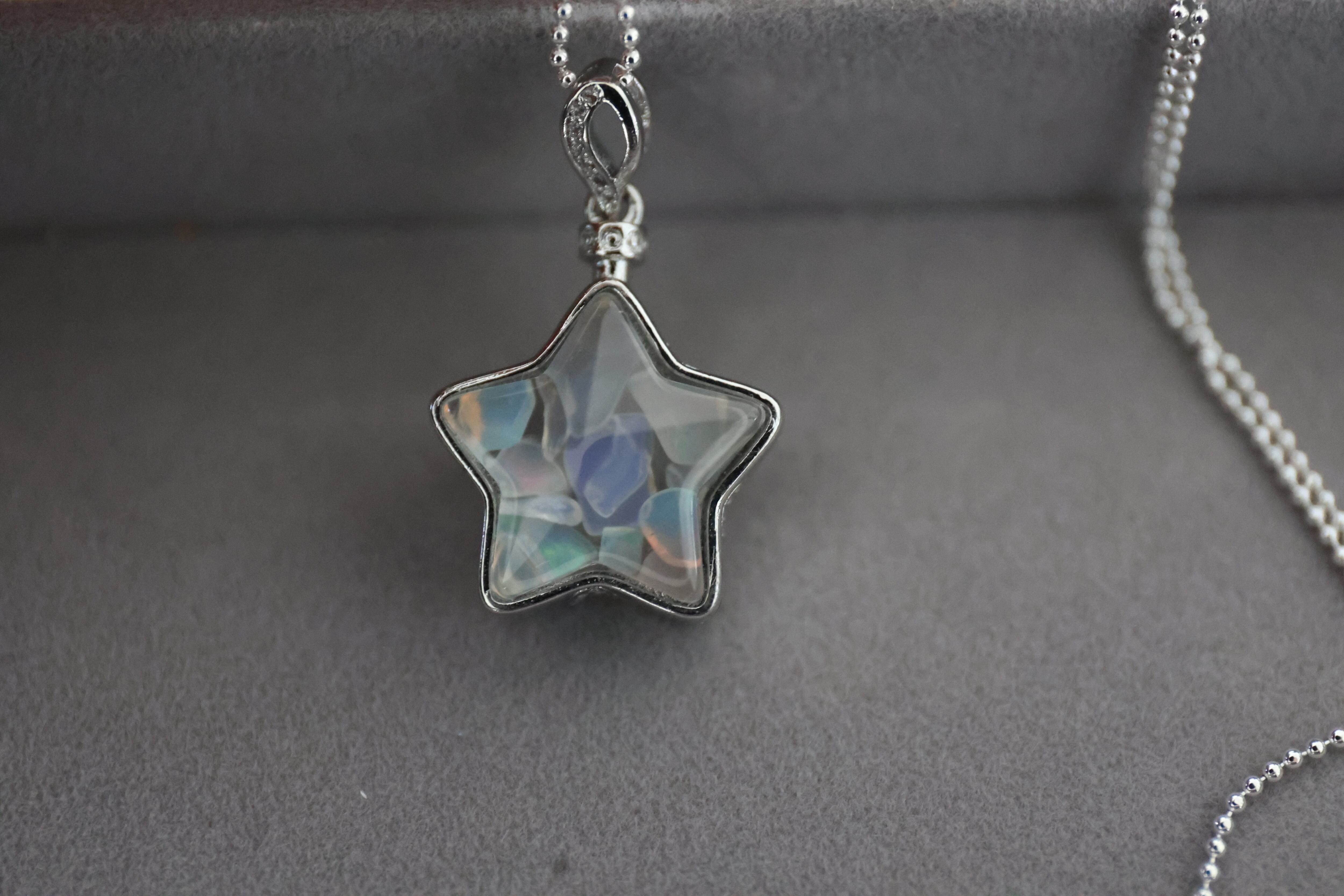 お星さまのモチーフの中に、エチオピア産プレシャスオパールを閉じ込めた、上品で遊び心のあるペンダント。