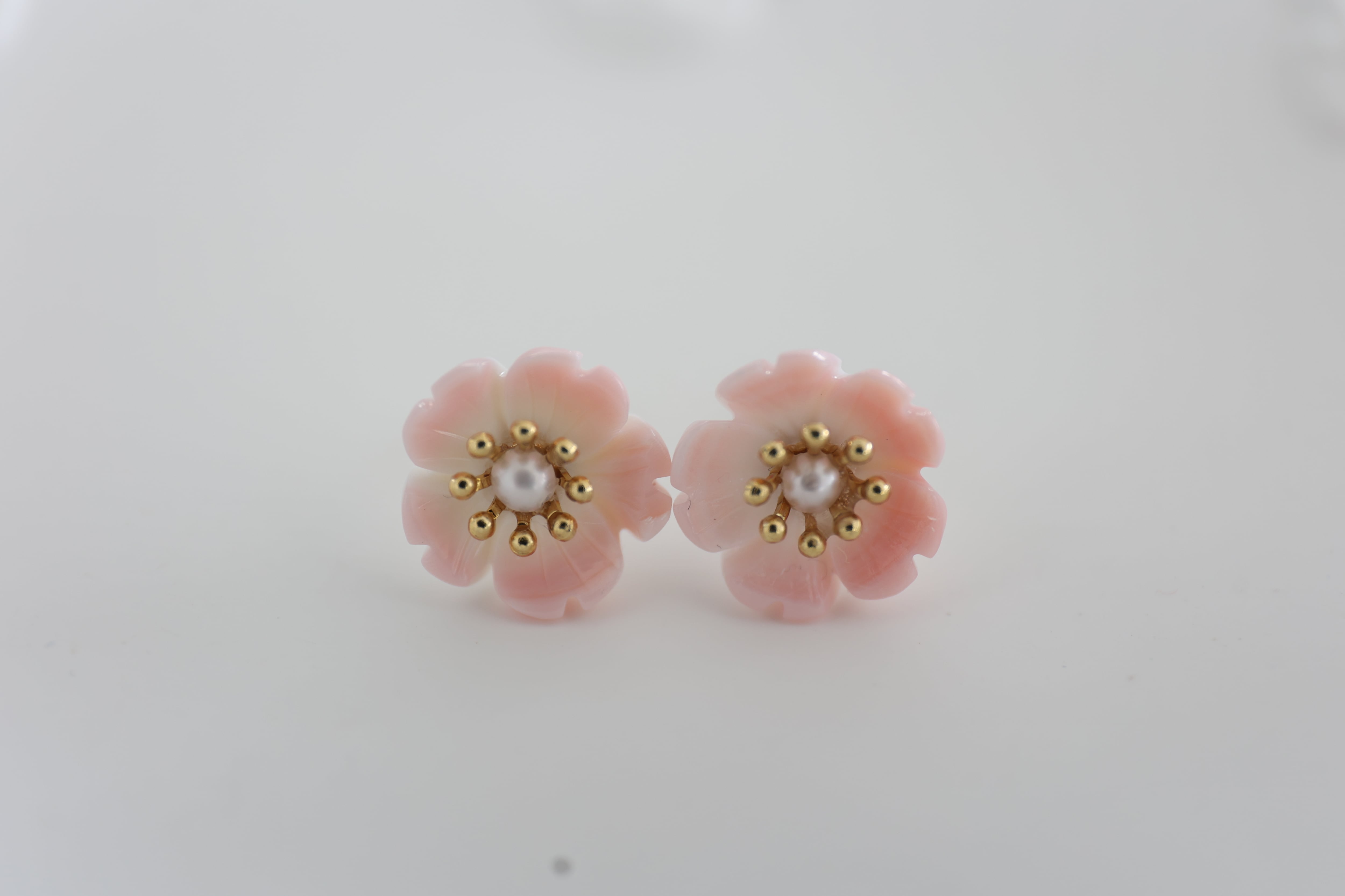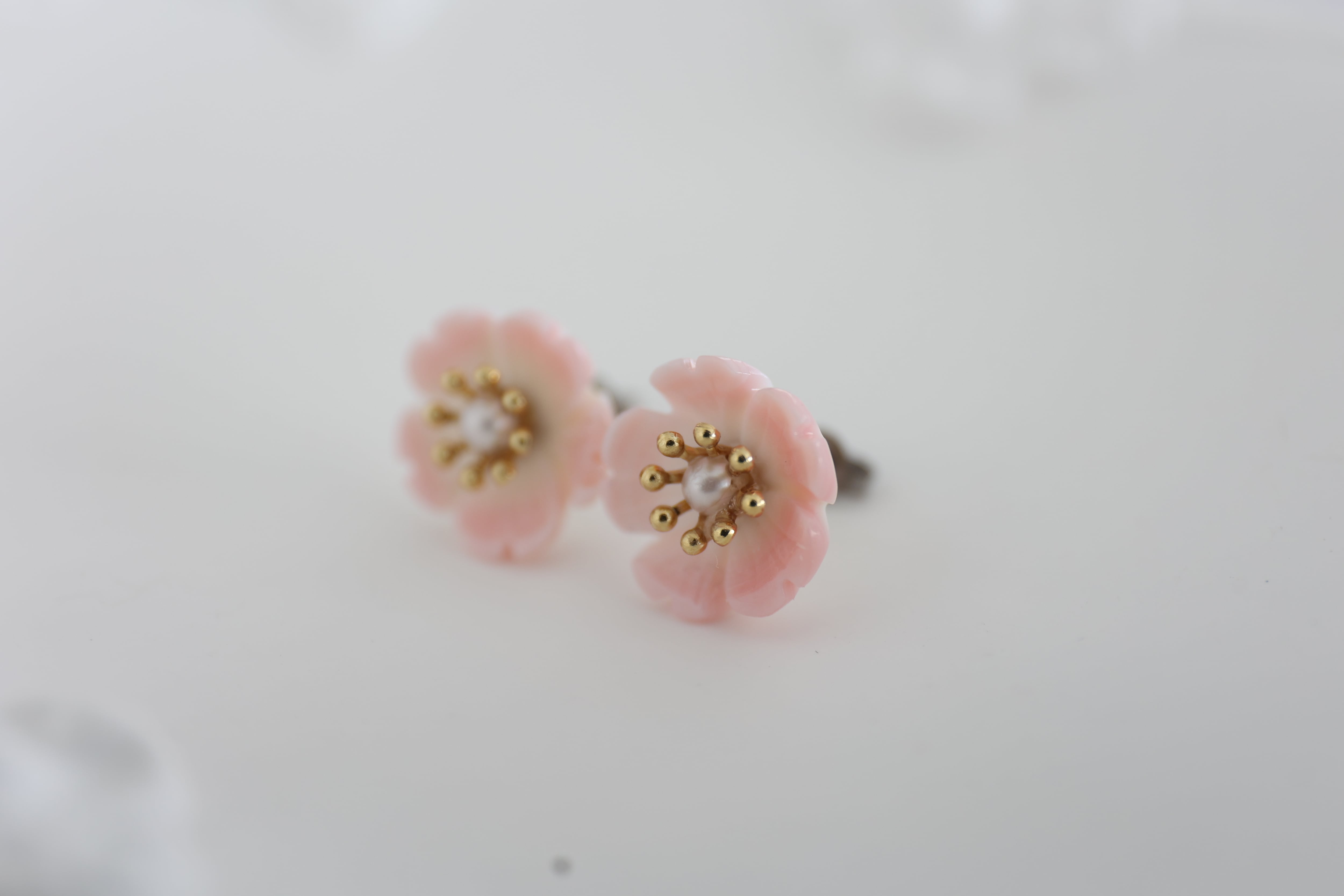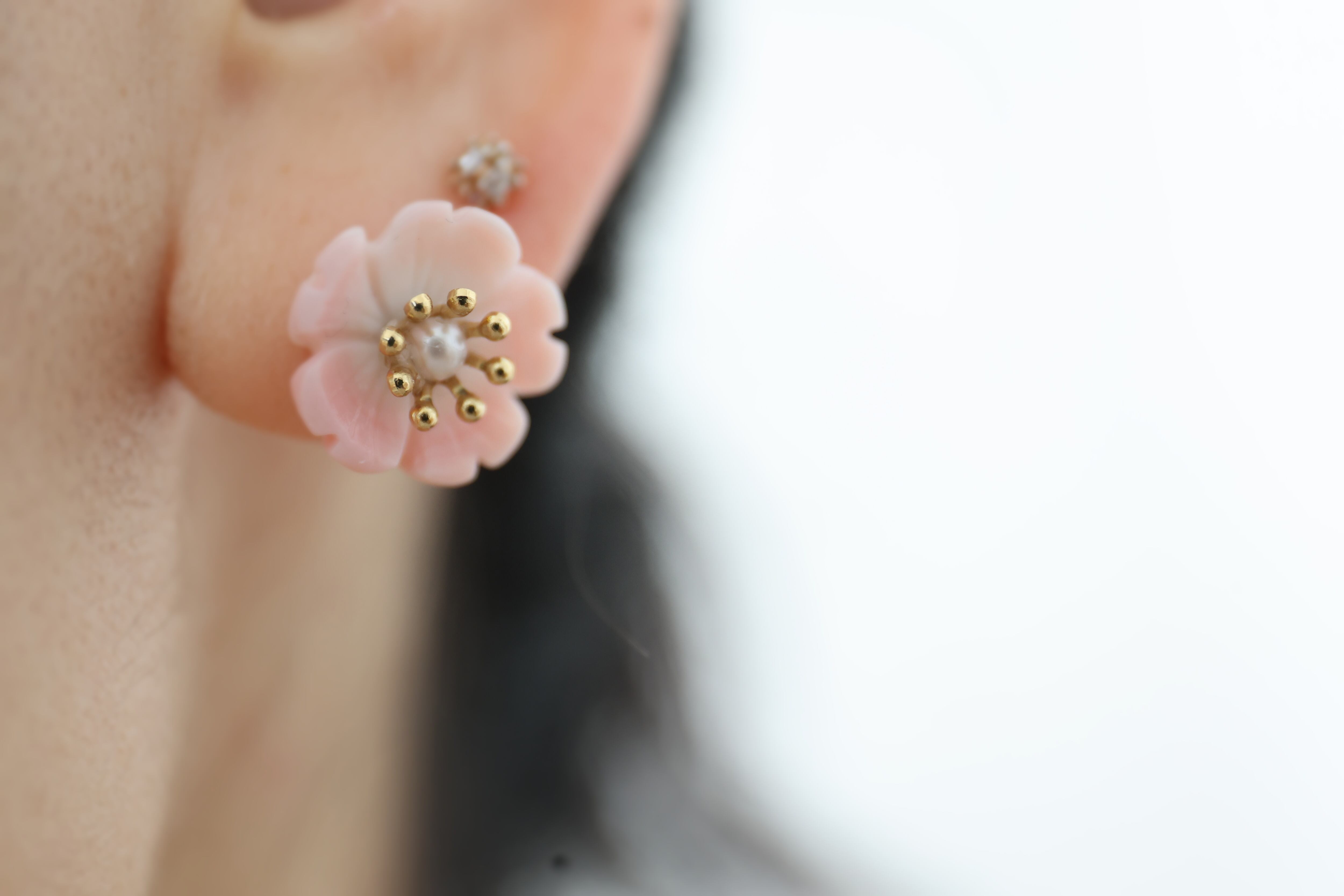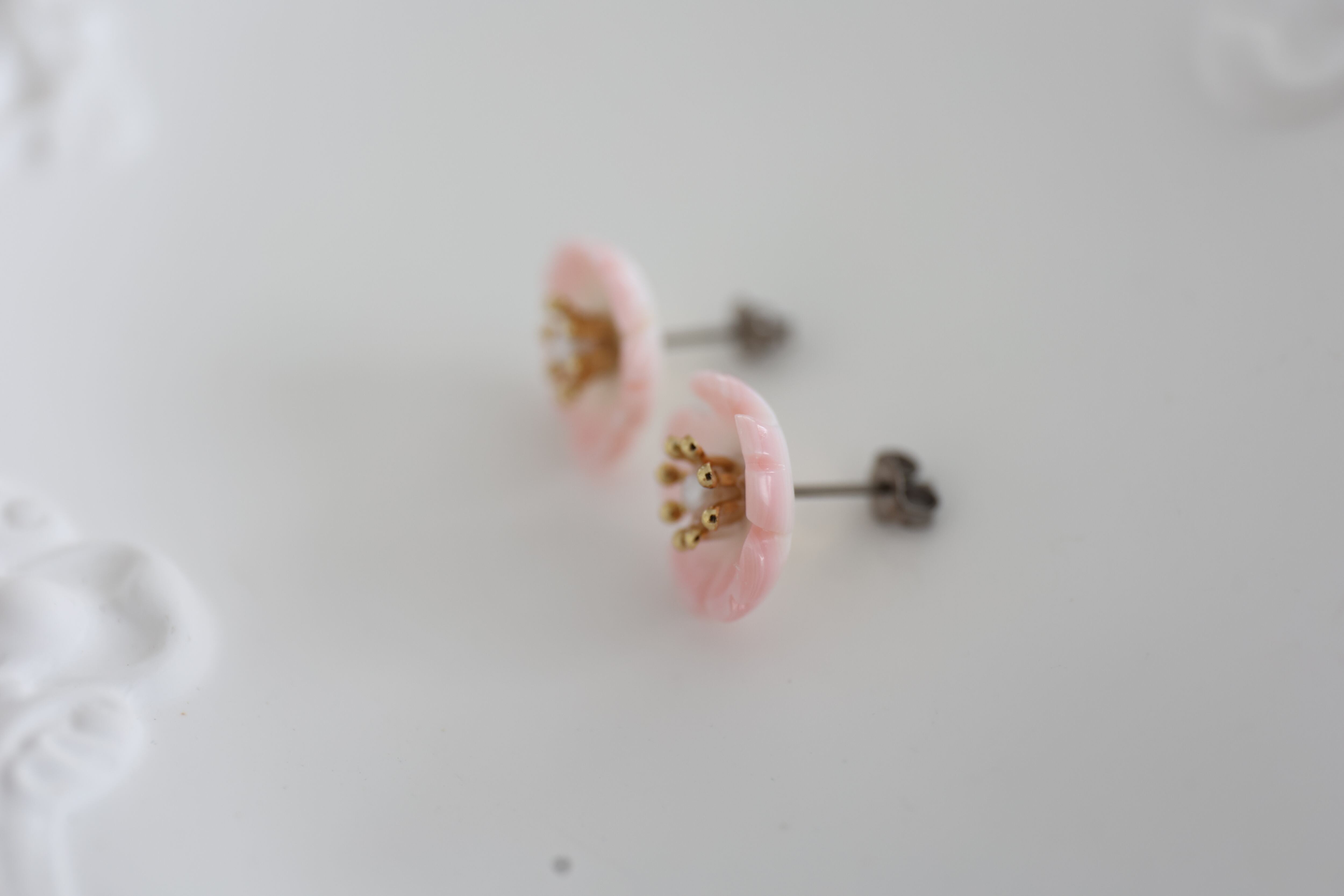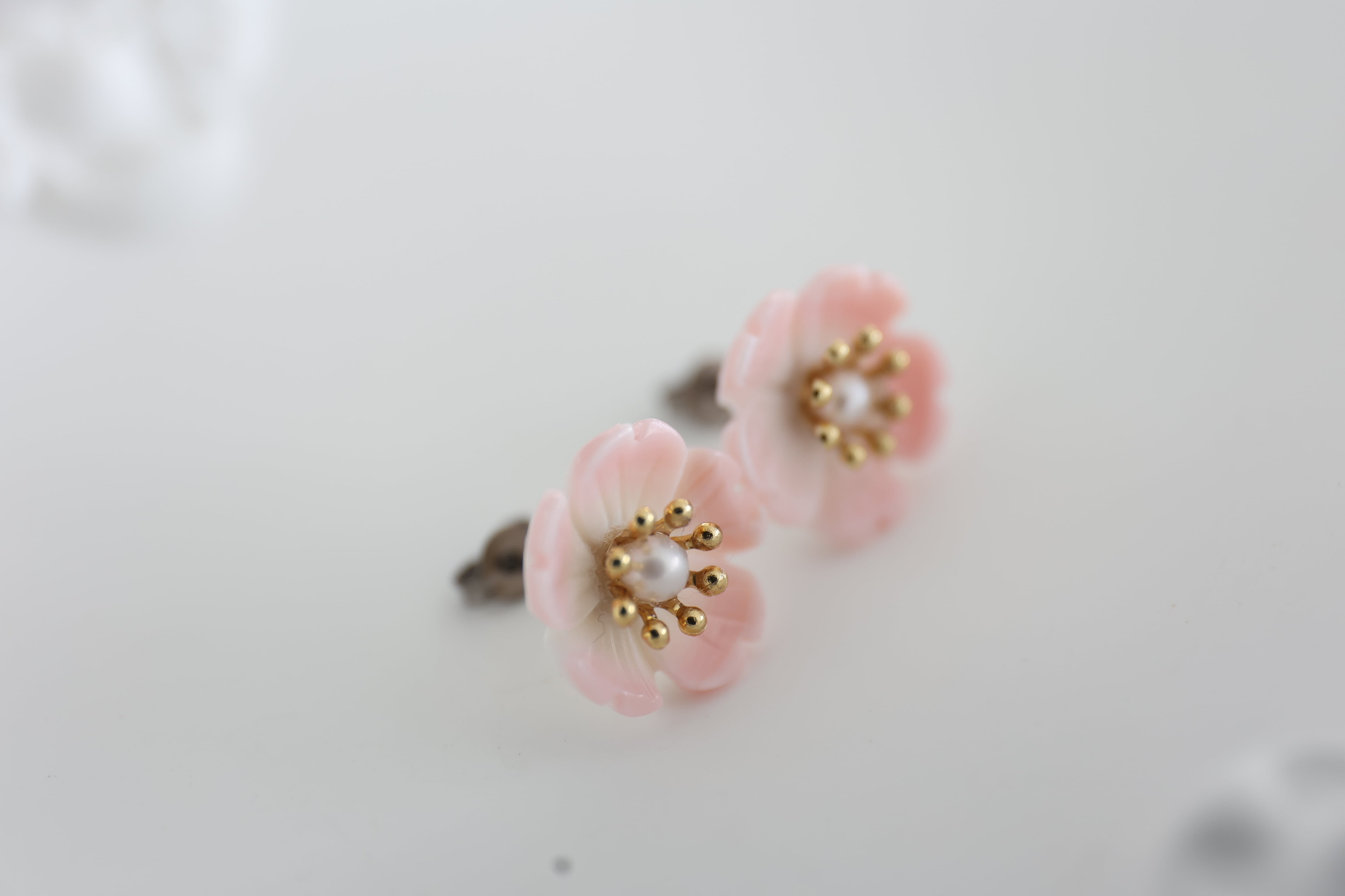 丁寧に(削り)形にした、淡いピンクの桜花のピアス。