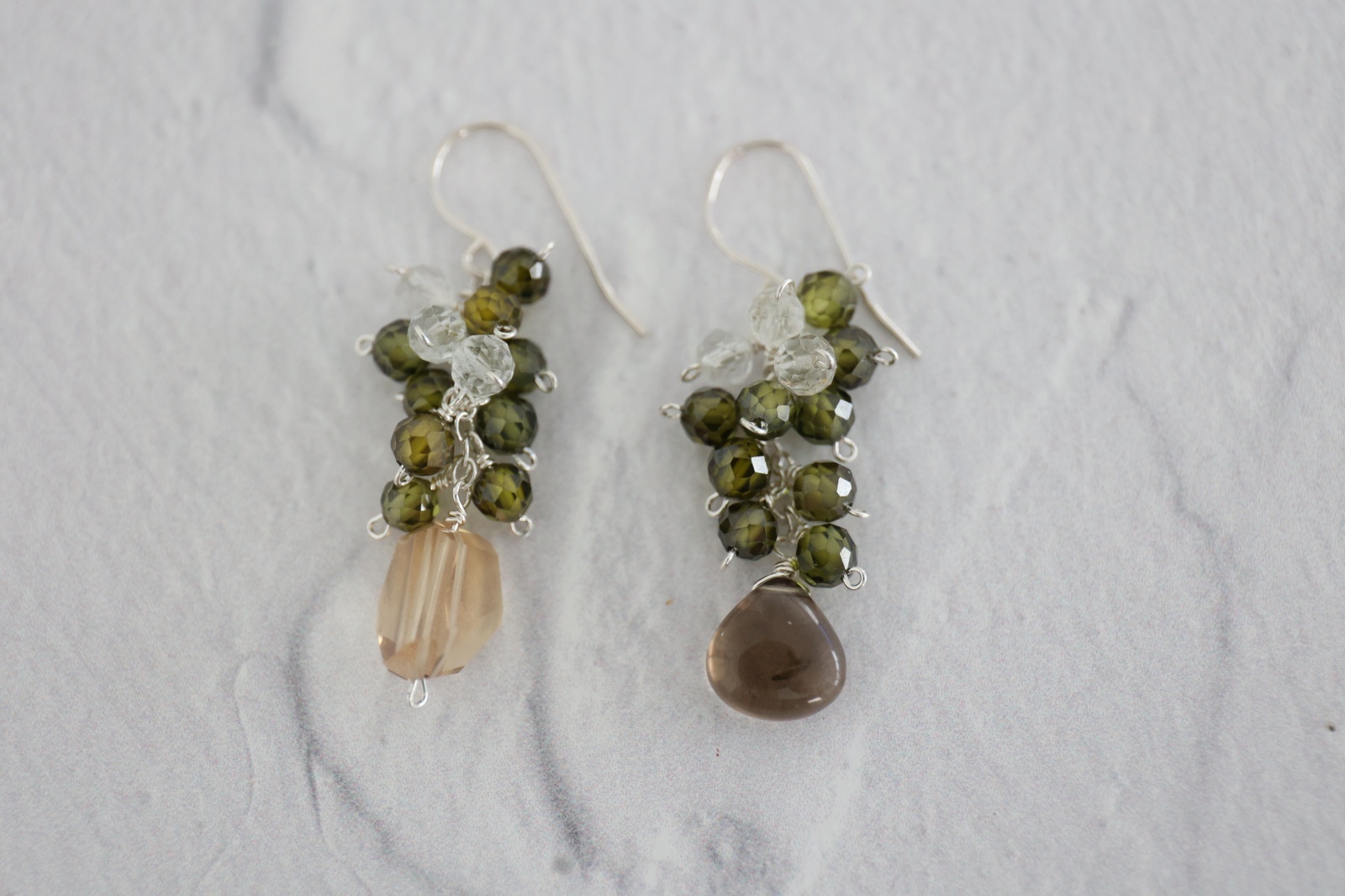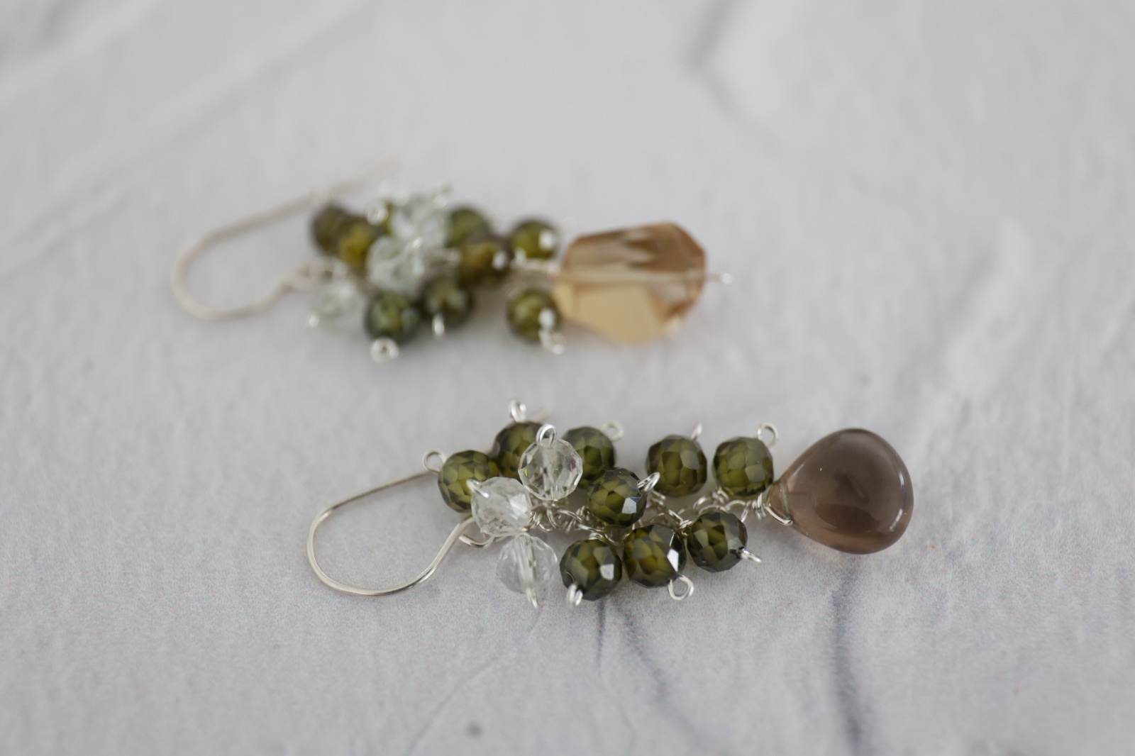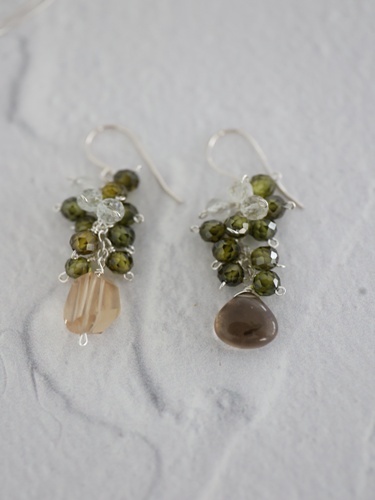 アシンメトリーに配したスモーキークォーツとシャンパンゴールドクォーツはやや大きめで存在感があります。