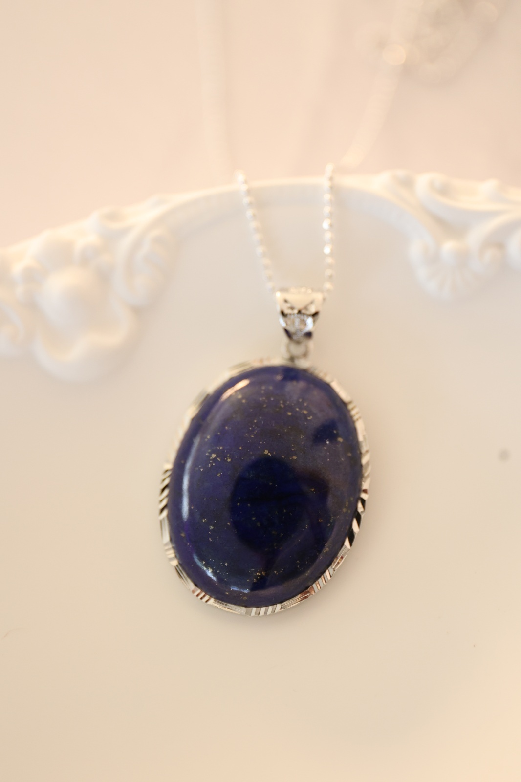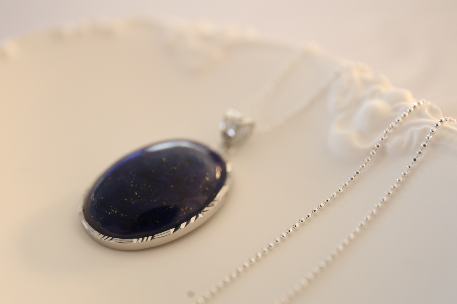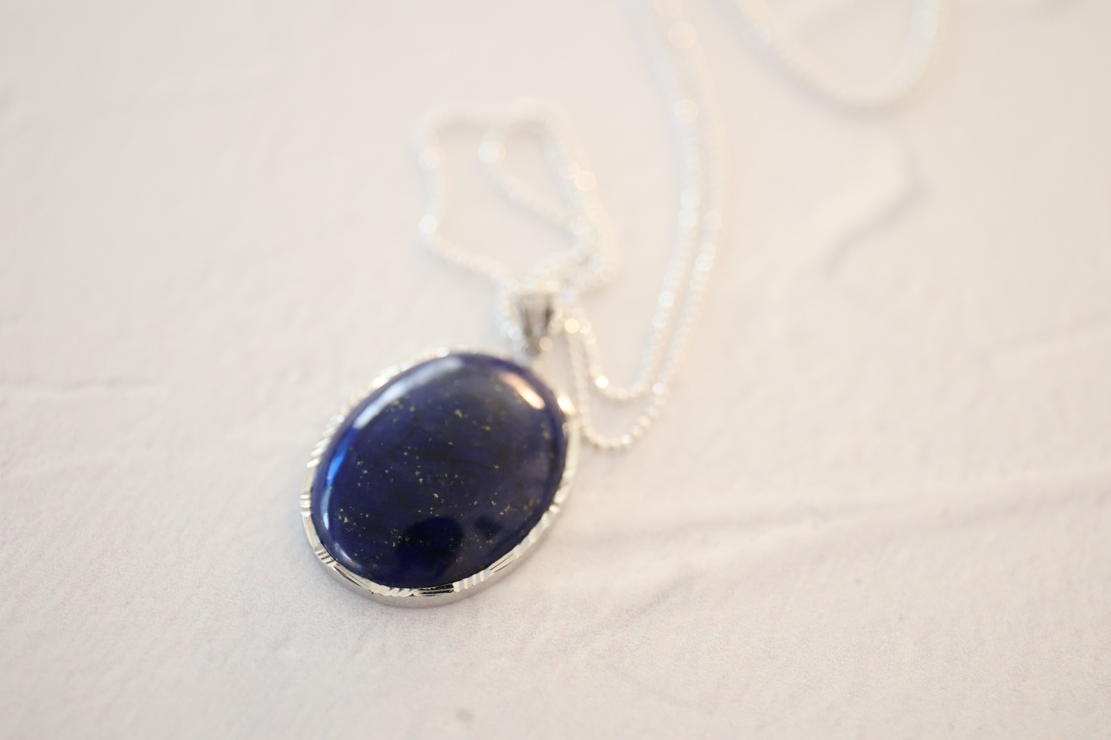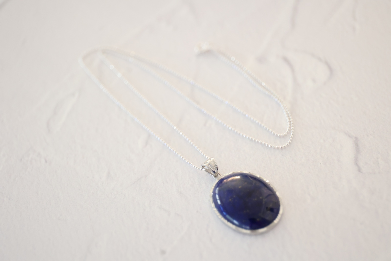 シルバーの縁取りが美しい、ラピスラズリのペンダントネックレス。